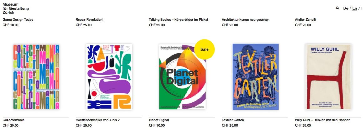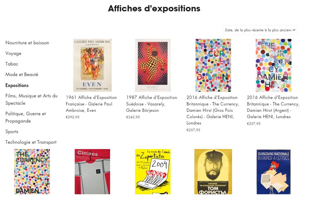 Le site internet de L’affichiste propose, rubrique « Expositions », des affiches réalisées par des institutions renommées, souvent en étroite collaboration avec les artistes, et publiées en éditions limitées. Le prix est supérieur à celui d’un poster mais on acquière un objet d’époque. Il faut noter que les affiches ne sont pas classées par artiste.