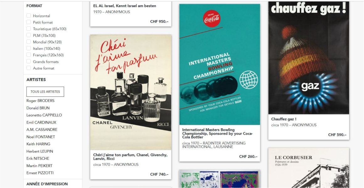 Dans cette galerie à Genève, on ne parle pas de posters mais de vraies affiches publicitaires qui ont habillé les rues avec des messages politiques, promotionnels et touristiques. La Galerie 1 2 3 possède l’une des plus importantes collections d’affiches anciennes originales au monde. Le site est doté d’un moteur de recherche efficace qui permet notamment de (re)découvrir des œuvres placardées en Suisse, par style, année et thématique. Un vrai plus pour apporter une touche vintage à sa décoration. galerie123.com