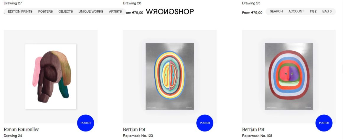The Wrong shop est un autre site où l’on trouve des affiches de designers contemporains en vogue, que ce soit dans le monde du graphisme (Philippe Weisbecker) ou de l’équipement de la maison (Pierre Charpin, Nathalie Du Pasquier, Ronan et Erwan Bouroullec…). Prix autour de 300 £. thewrongshop.uk