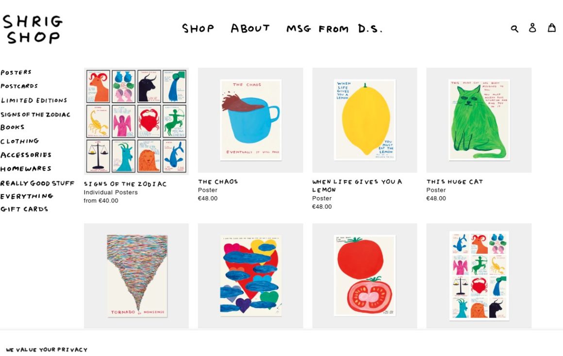 Connu pour ses satires artistiques, David Shrigley utilise le dessin avec humour. Shrig Shop est une boutique à Copenhague fondée par l’artiste et son galeriste et ami de longue date Nicolai Wallne.