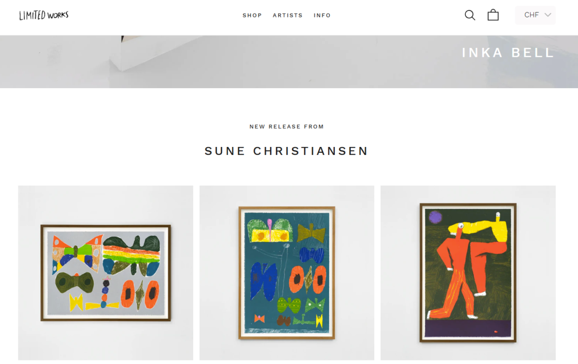 Limited Works est une boutique à Copenhague et un magasin en ligne existant depuis 2011. L’entreprise est spécialisée dans l’art sur papier et collabore avec des artistes danois et internationaux. Elle propose des œuvres originales sur papier et une large gamme de graphiques tels que des sérigraphies, des gravures, des lithographies, des linogravures et des risographies. limitedworks.com