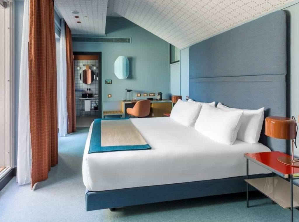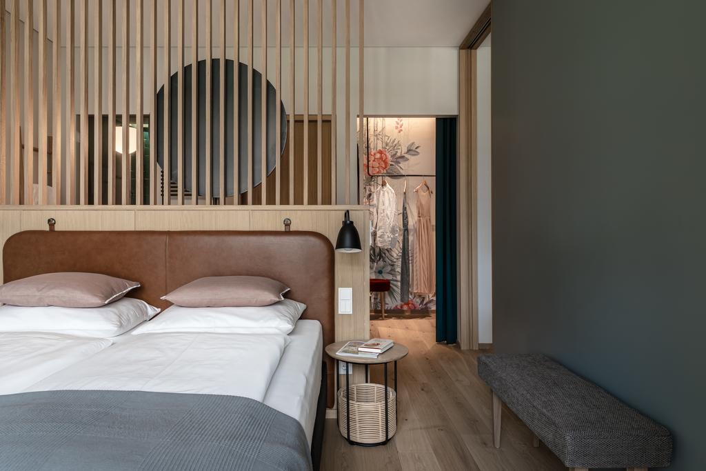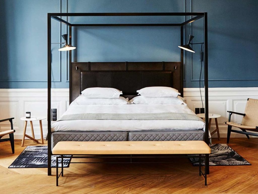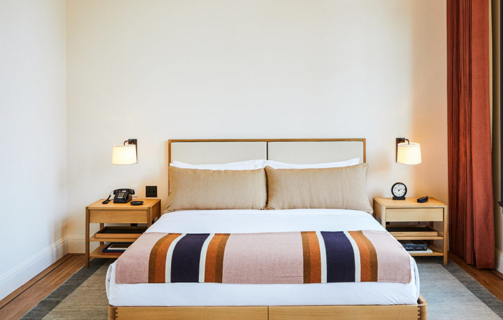Ici non plus, pas de coussins qui ne puissent servir d’oreillers. Mais les oreillers, placés à la verticale l’un derrière l’autre, sont beaucoup plus visibles. L’aspect strict et net de cet arrangement est renforcé par le pliage d’une petite couverture qui ne déborde pas sur les côtés. Les motifs géométriques des couvertures égayent la parure, sans rompre l’esthétique rationnelle de l’arrangement.