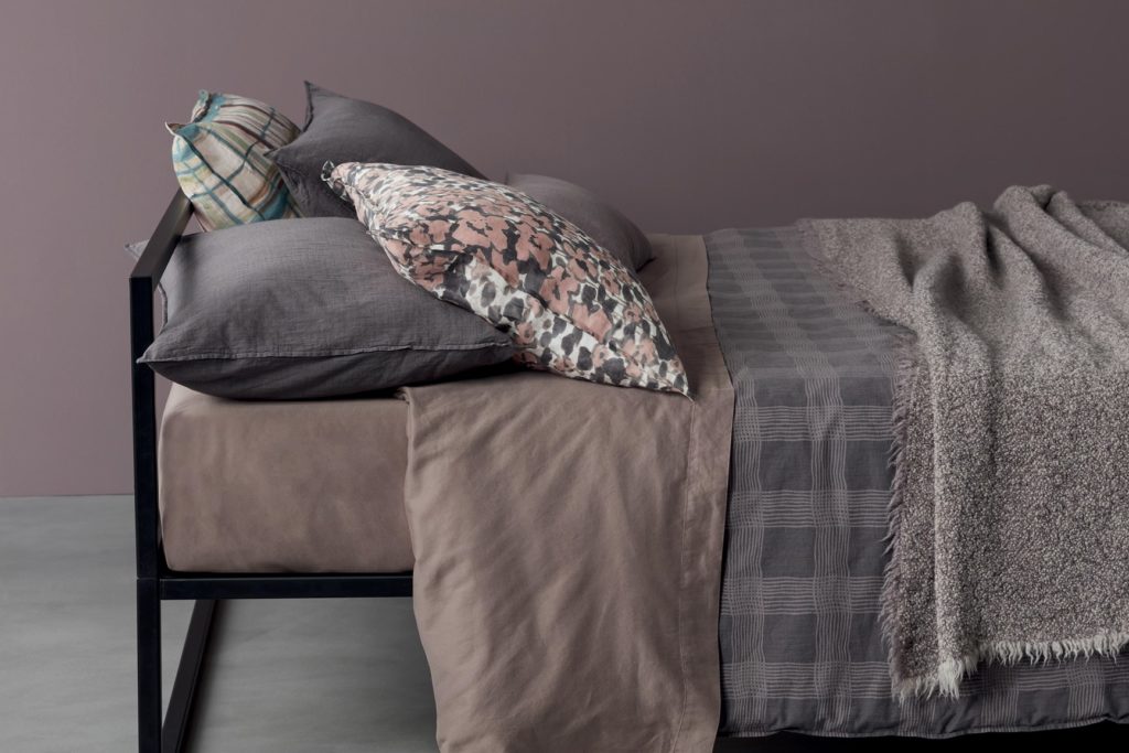 Un arrangement dissymétrique fonctionne bien avec 4 ou 5 coussins. Pour créer ce type d’effet, on peut placer une quantité différente de coussins de chaque côté du lit ou créer un simple effet de décalage. Mixer les textiles unis et les motifs renforce l’impact de l’arrangement.