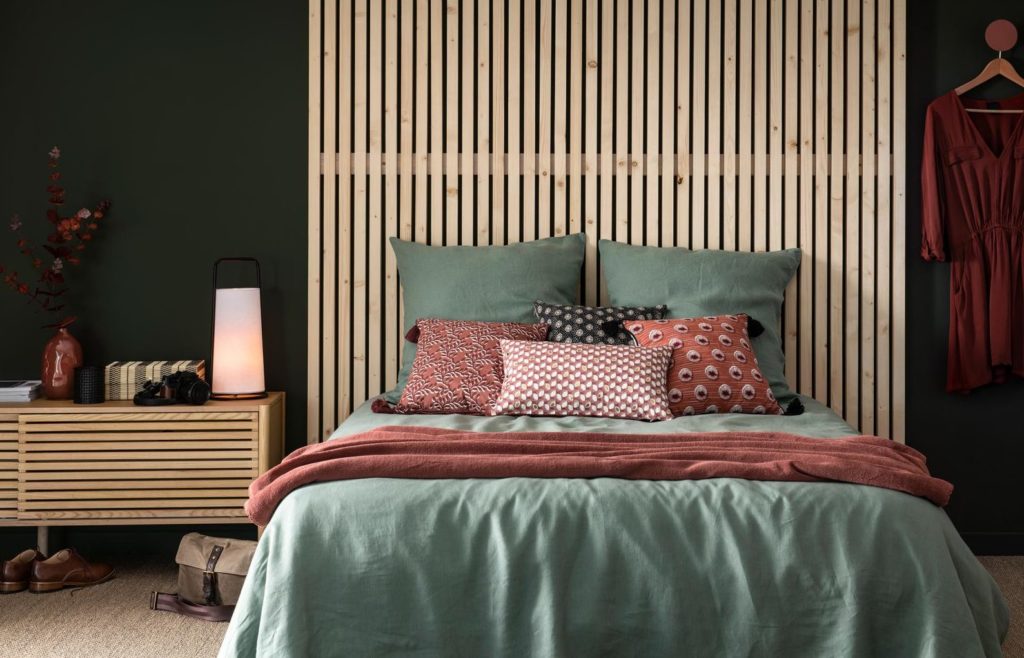 Pour un lit bohême et romantique, on multiplie les coussins décoratifs. On mélange les unis et les motifs graphiques et on mixte les matières. Afin de ne pas donner une allure trop déconstruite ou désordonnée au lit, on a choisi ici d’arranger les coussins de manière à former une pointe. Le plaid, simplement jeté sur un bord du lit, apporte une note de légèreté.
