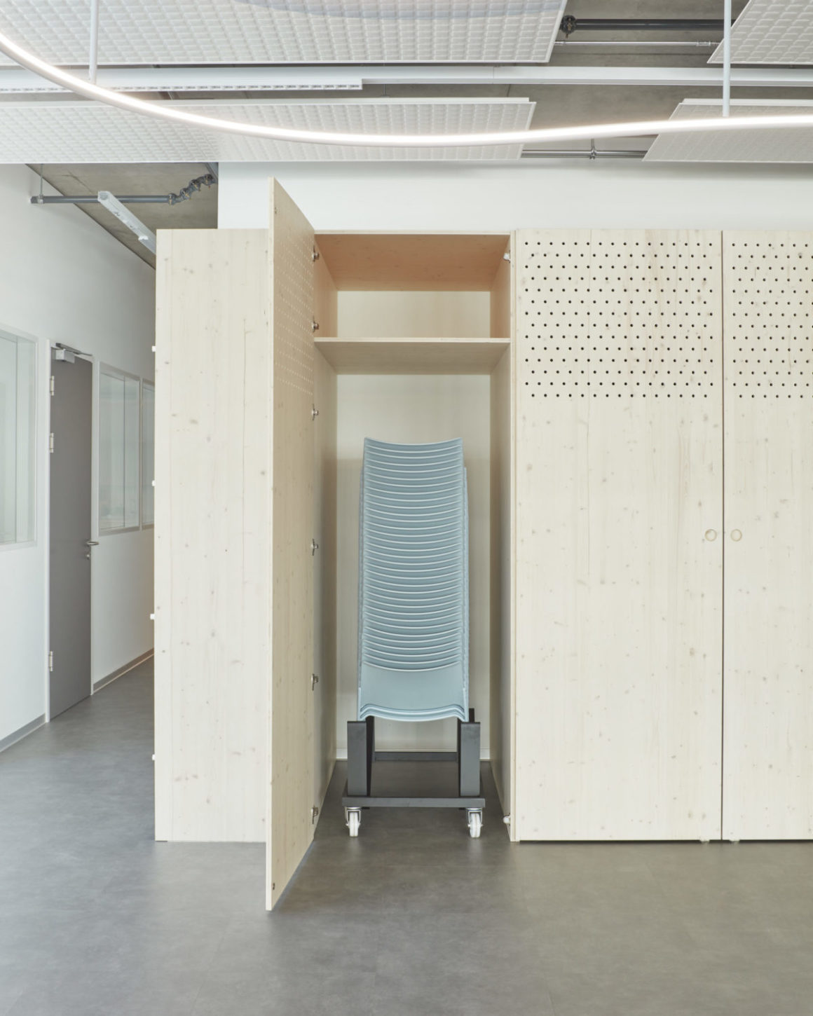 C’est sous mandat de la HEAD – elle même mandatée par la Fondation Immobilière des Entreprises Sociales (FIDES) – que le bureau Apropå a été amené à aménager ce bâtiment de Plan-les-Ouates pour en faire un espace de travail commun pour plusieurs institutions sociales du Canton de Genève. Les locaux de ce pôle innovation abritent une cuisine, un espace convivial, une salle pour prototyper des projets (Fablab) et des bureaux administratifs qui peuvent être transformés en worshops ou espaces de conférences. Ainsi, la surface de 520m² a été aménagée de manière à pouvoir moduler et transformer le lieu en fonction des besoins, avec des meubles réalisés par des artisans menuisiers de la Fondation Trajets.
