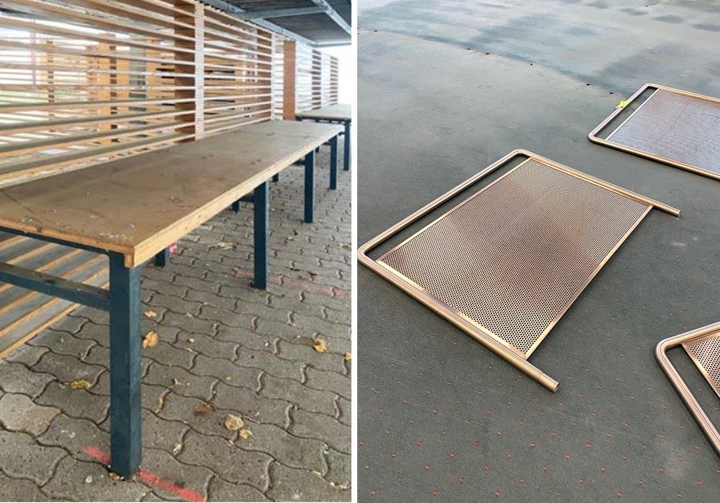 Établis, grilles métalliques et autres éléments provenant de l’ancienne caserne des Vernets et de chantiers de déconstruction ont été réemployés et adaptés pour réaliser des bureaux et des étagères.