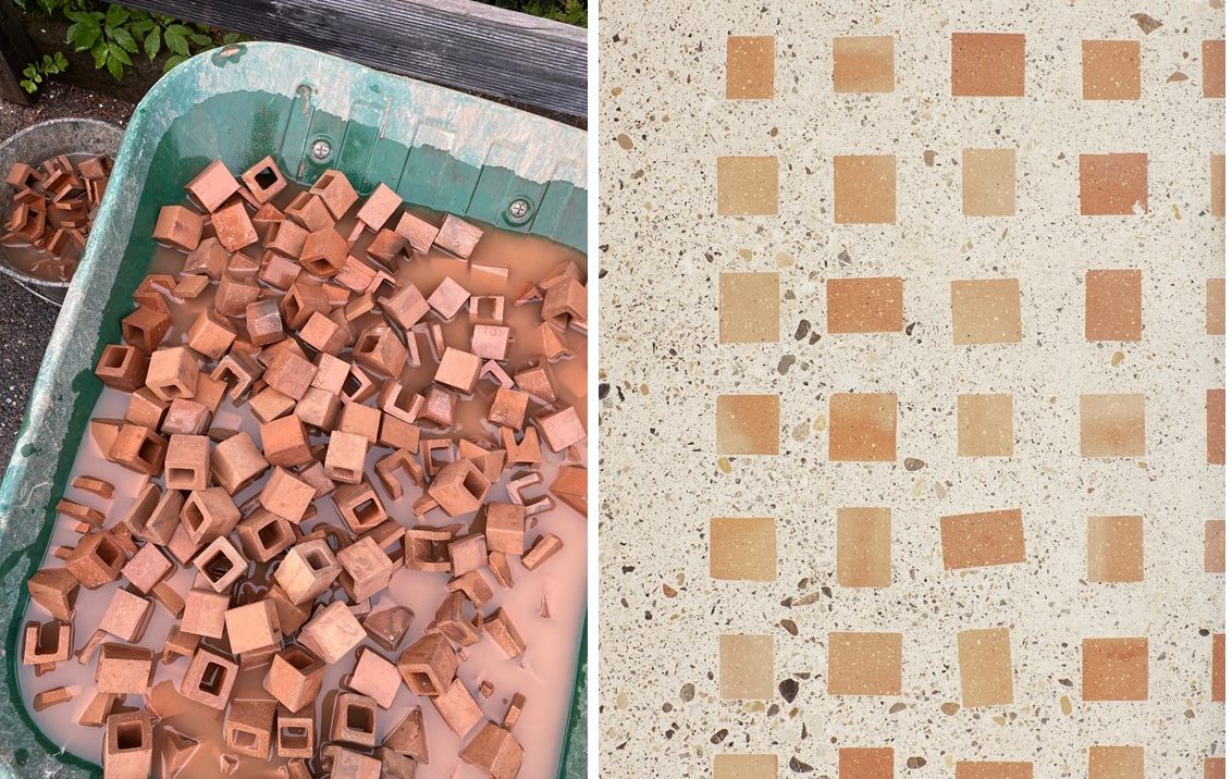 Faire avec ce qui existe déjà est au cœur de la démarche d’Apropå. C’est ainsi que le plateau de l’îlot de la cuisine a été conçu à partir d’une fin de stock de briques de Bardonnex. La fabrication du plateau s’est déroulée en plusieurs étapes. Tout d’abord, les briques ont été sciées et les fragments placés dans de grands moules. Du ciment a ensuite été coulé entre les briques. Enfin, la surface a été poncée puis vernis afin de limiter la porosité des briques et du ciment.