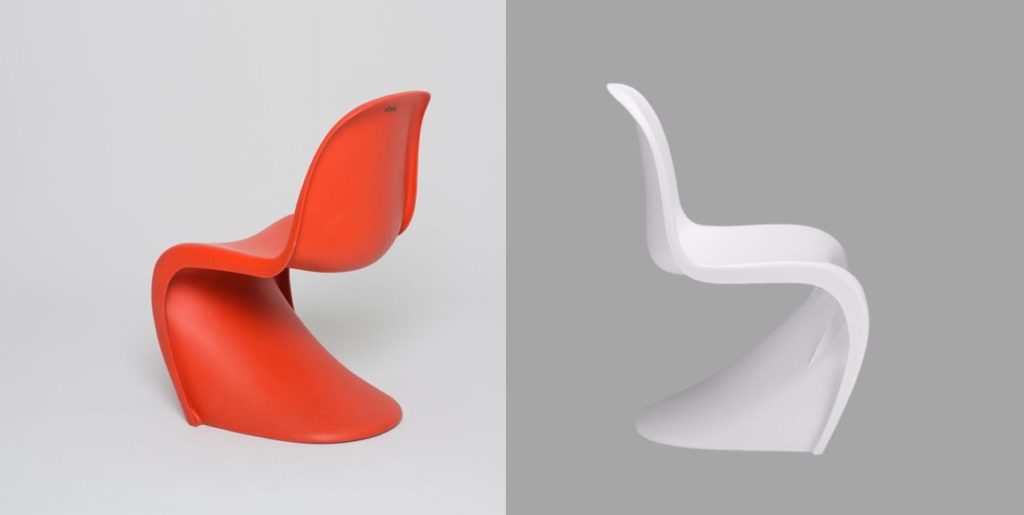 À l’origine, la Panton Chair était fabriquée en fibre de verre, dans une version plus grande et plus lourde que toutes les autres. Après cela, la chaise a été produite en mousse Baydur (1968-71), en plastique dur injecté polystyrol (1971-79), en mousse dure (1983-1999) et aujourd’hui en polypropylène. Sur le vrai modèle, le dossier présente un galbe doux, sans méplat. Il n’y a pas de renfort entre le dessous de l’assise et le traîneau inférieur, sauf sur certains modèles anciens. On a la signature de Verner Panton, puis le logo Vitra qui sont surmoulés. Dans les années septante, un logo Herman Miller était posé sous forme d’autocollant ou imprimé dans la masse. La signature Verner Panton n’est apparue que dans les années 80. Plus d’infos: vitra.com