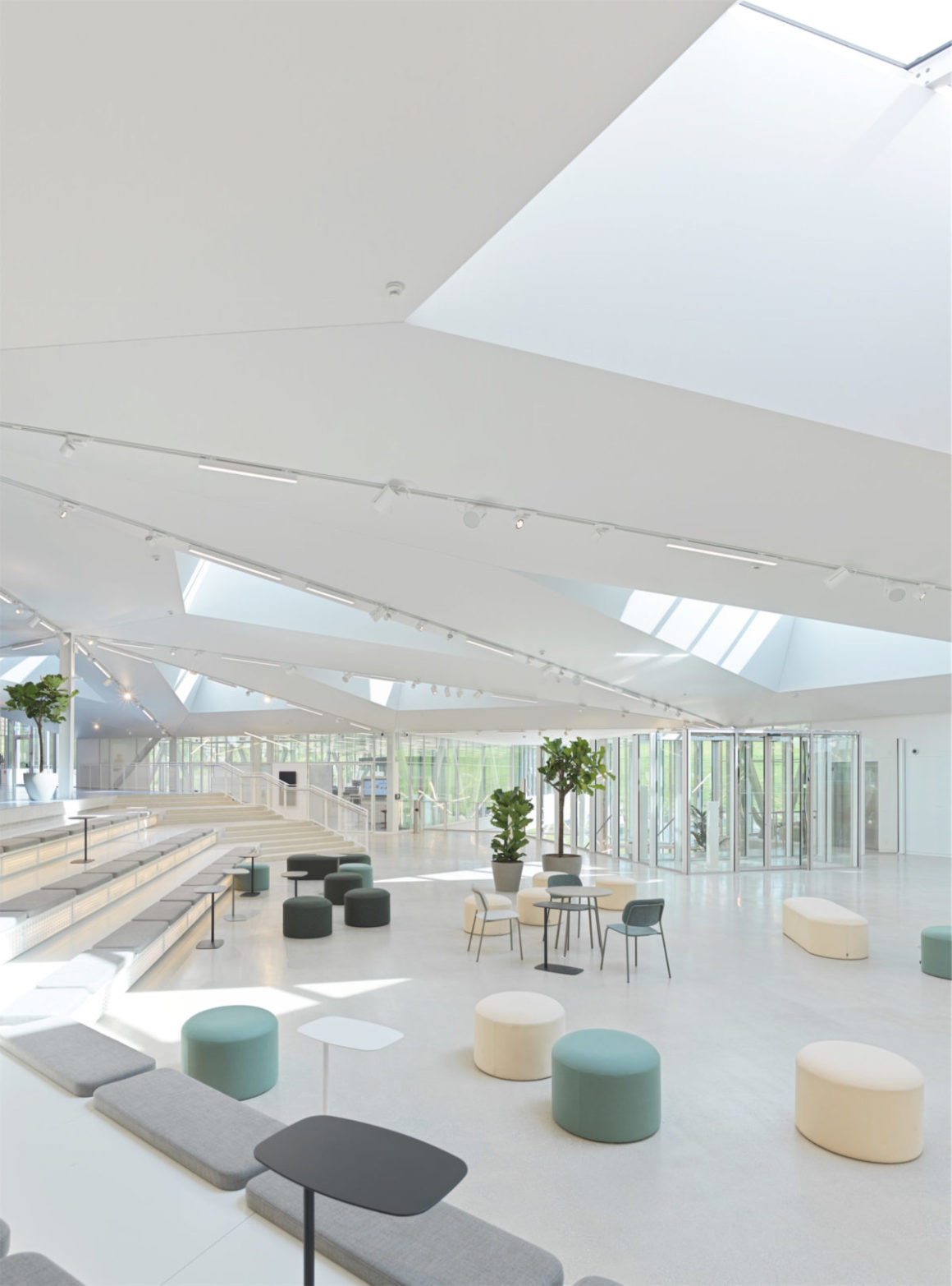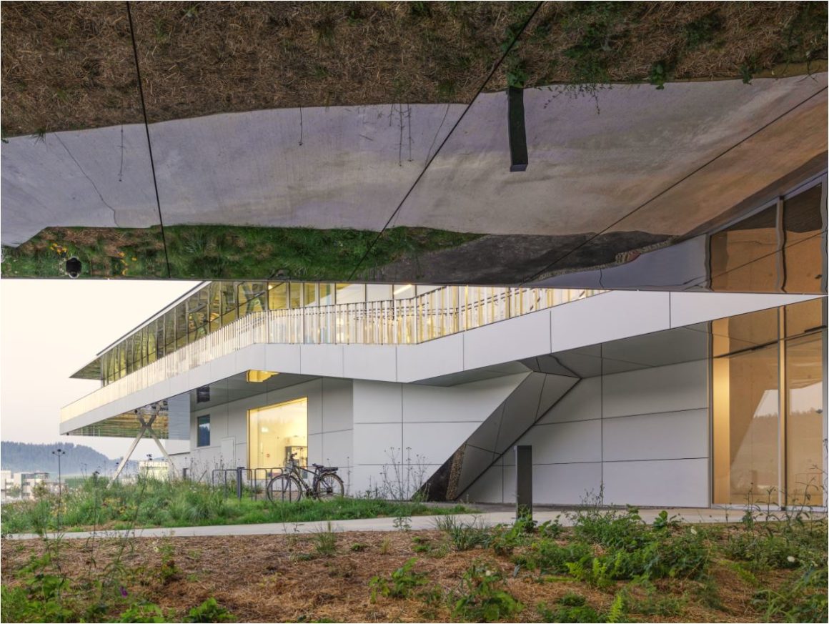 Une architecture qui se fond dans le paysage: depuis l’extérieur, les abords du bâtiment sont aménagés avec un jardin conçu comme une suite de biotopes naturels locaux qui favorisent une biodiversité riche autour du bâtiment. Sous les éléments surélevés en porte-à-faux, des plafonds en inox reflètent et déforment le paysage lointain et le jardin naturel selon la position du visiteur, provoquant une immersion dans la géographie de la région. Ce dispositif crée des façades à vivre qui n’ont pas uniquement vocation à séparer l’intérieur de l’extérieur.