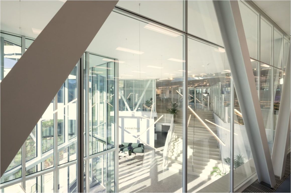 Une architecture médiatrice: non seulement le bâtiment prévoit de s’adapter aux mutations industrielles à venir mais il est aussi l’instigateur de certaines de ces mutations, à l’instar de l’intégration d’espaces sociaux ayant vocation à la création d’une communauté. Ainsi, au centre du dispositif se trouve un grand espace de rencontre, la Piazza. Cet espace de 900 m2 naît du besoin de relier les différents secteurs jusqu’à présent indépendants et hermétiques. La Piazza s’est ainsi formalisée au milieu des flux, au cœur du dispositif. Elle constitue à la fois le couloir de service entre les secteurs et un espace favorisant les échanges informels et la créativité, faisant d’elle un espace de référence pour l’ensemble des usagers,employés et visiteurs.