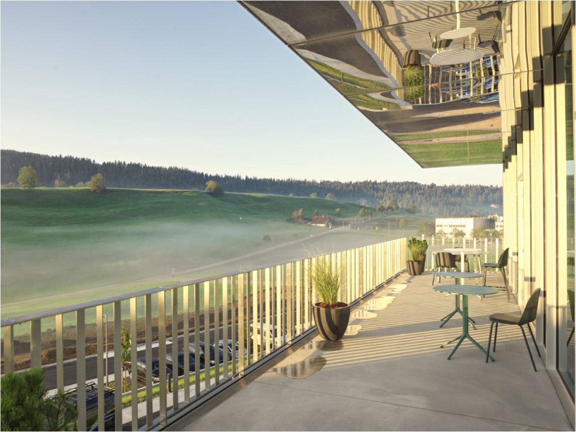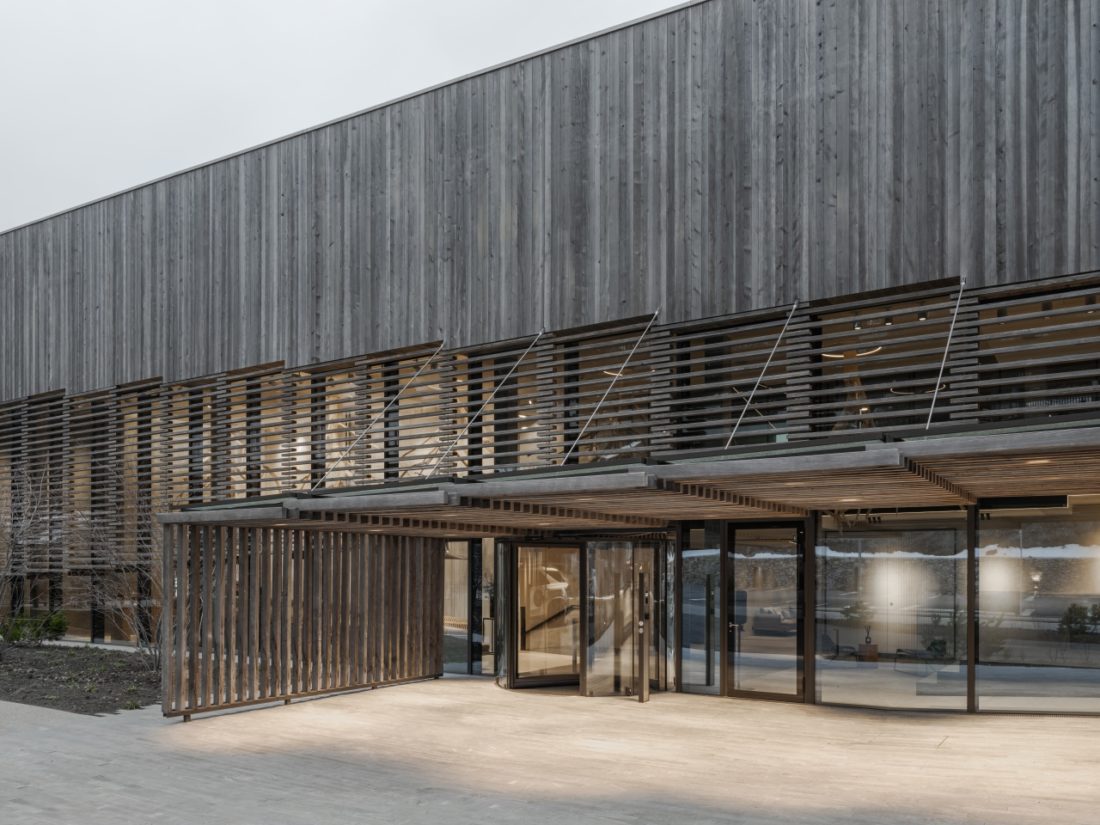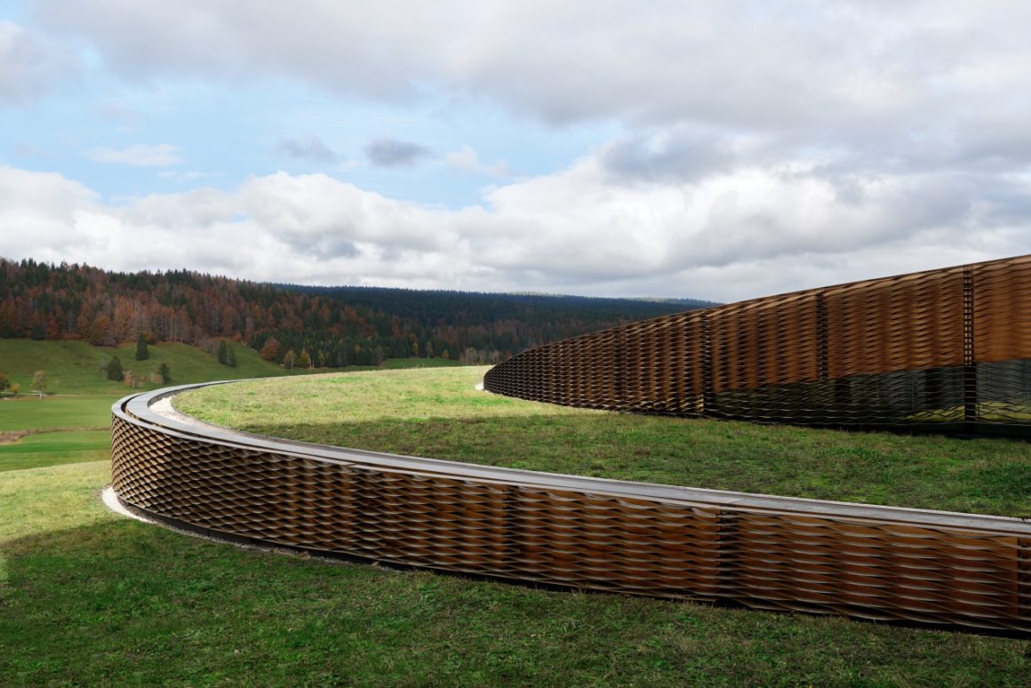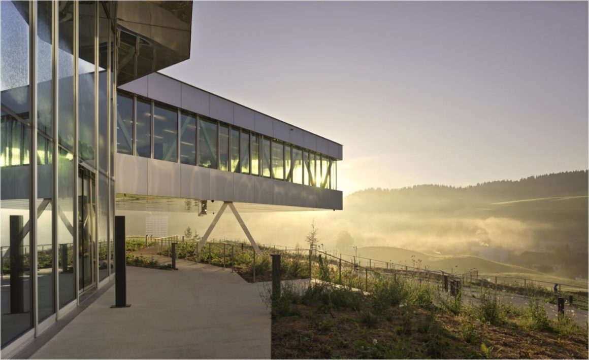 - Une forme architecturale inspirée par la vallée de Joux et la forêt du Risoud. Au lieu de la typologie générique d’un bâtiment aux étages empilés, la forme suit la topographie de la vallée. Ainsi, un ingénieux système de dalles en béton disposées en zigzags se déploie en douceur le long du site. Avec une façade en lame de mélèze de la région, la construction semble ainsi être un morceau de terre étiré.