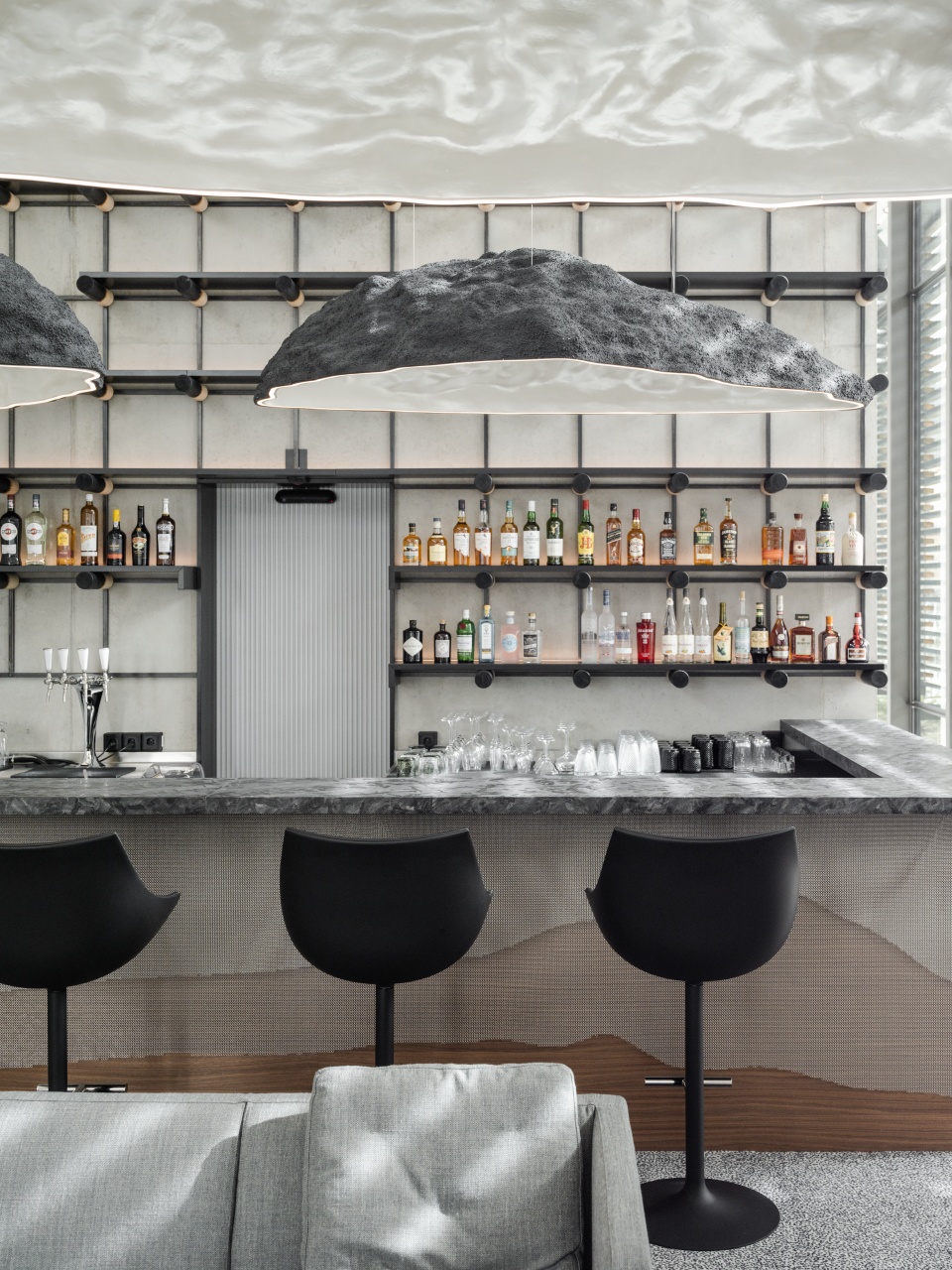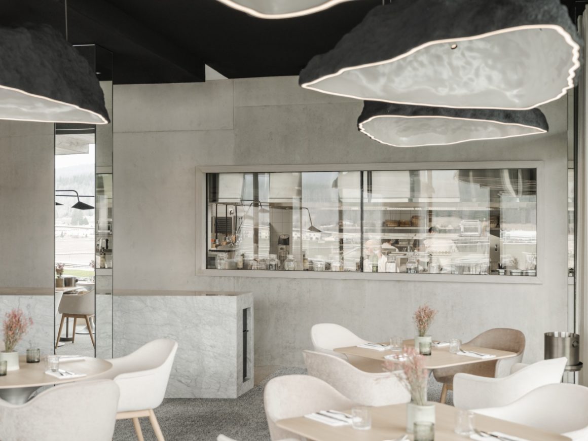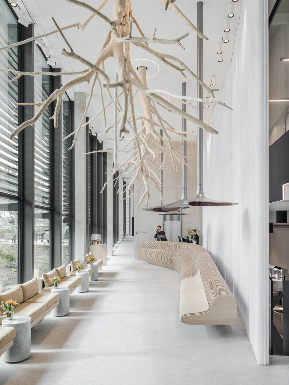 Une décoration intérieure inspirée par la nature. L’agence d’architecture AUM fait entrer le Jura suisse dans le bâtiment, aussi bien la pierre que les arbres et la végétation. Un important travail sur les luminaires a notamment été réalisé. Certains reprennent la forme de champignons, d’autres celle de feuilles se trouvant dans la forêt du Risoud, d’autres encore celle d’un profil topographique inversé de lac.