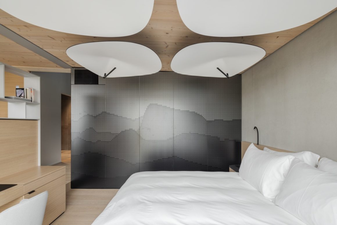 Le profil de la Dent de Vaulion se retrouve quant à lui au bar, avec un mur en cordes nouées et, en version imprimée, sur les armoires des chambres. À l’entrée, le meuble de réception reprend la forme d’une ammonite déployée; au plafond, des éléments en bois peuvent être interprétés comme des racines sous la terre ou comme des arbres à l’envers. La décoration intérieure joue ainsi sur des références naturelles détournées, créant un rapport onirique avec celles-ci et brouillant la frontière entre le construit et le naturel.