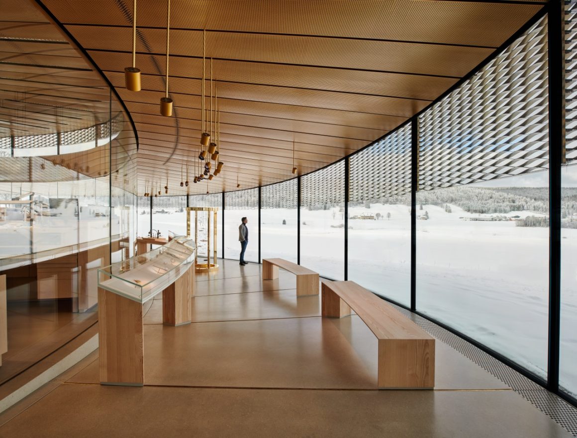 Une architecture évoquant le design d’une montre: au niveau de la spirale, le sol suit la pente naturelle du terrain et propose une expérience spatiale linéaire et continue. Les parois de verre incurvées convergent dans le sens des aiguilles d’une montre vers le centre de la spirale, l’idée originale étant de reproduire le mouvement d’un ressort spiral de montre. Des lamelles en laiton, soudées, encerclent la façade et filtrent la lumière tout en conservant la vue sur le paysage. Leur profondeur varie en fonction des orientations. Deux ateliers traditionnels, «Grandes complications» et «Métiers d’art», qui nécessitent un environnement de travail particulièrement exigeant, prennent place au centre de la spirale.