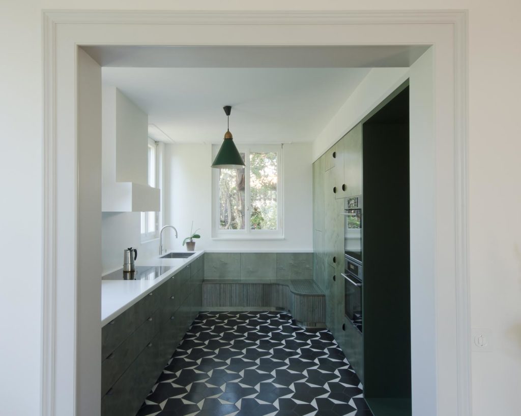 Grâce à l’ouverture de la cuisine sur la salle à manger, la pièce peut se déployer côté sud. Une nouvelle disposition de l’électroménager met en opposition les éléments hauts (réfrigérateur, four et rangements) et les éléments bas (évier, plan de travail) et laisse un dégagement en hauteur côté fenêtres. Modernisés par un motif géométrique noir et blanc, les carreaux de ciment évoquent les sols typiques des cuisines du début du XXe siècle et signent l’époque de construction de la maison.