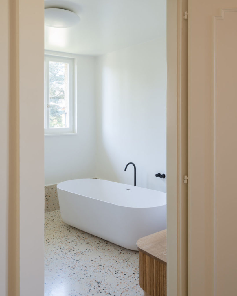 Pièce maîtresse du premier étage, la salle de bain d’origine était démesurée. Entièrement refaite, elle a été redimensionnée, mais conserve douche, grande baignoire, toilettes et espaces de rangement. Elle est dotée de très belles finitions et d’accessoires choisis, le tout rehaussé par un magnifique sol en terrazzo.