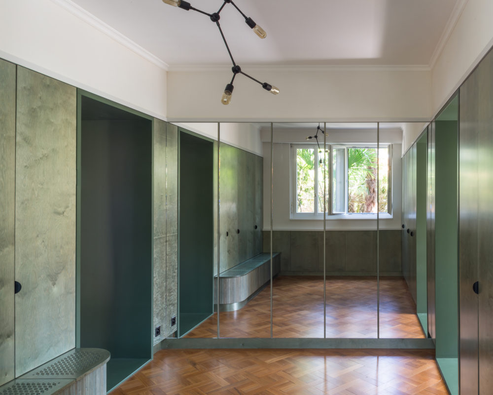 À l’entrée, l’ajout d’un vestibule a permis de créer une pièce de rangement pratique et fonctionnelle. Ce vestiaire familial a été entièrement réalisé en panneaux de bouleau déployé (dont l’écorce est déroulée et mise à plat) et vernis en vert. Le léger dégradé de chaque panneau a été ajusté pour donner une uniformité à l’ensemble. Le bois de bouleau a été privilégié par rapport au chêne, d’une part pour son prix et d’autre part, pour ses veines douces, moins marquées que celles du sapin. Les grands miroirs illuminent et agrandissent la pièce. Par ailleurs, la banquette perforée au motif « florette » (petites fleurs stylisées et petits points) est typiques des années 30. Proposé par le menuisier, ce motif constitue une citation de la date de construction de la maison. Posées manuellement une à une, les demi-baguettes de bois structurent verticalement la banquette.
