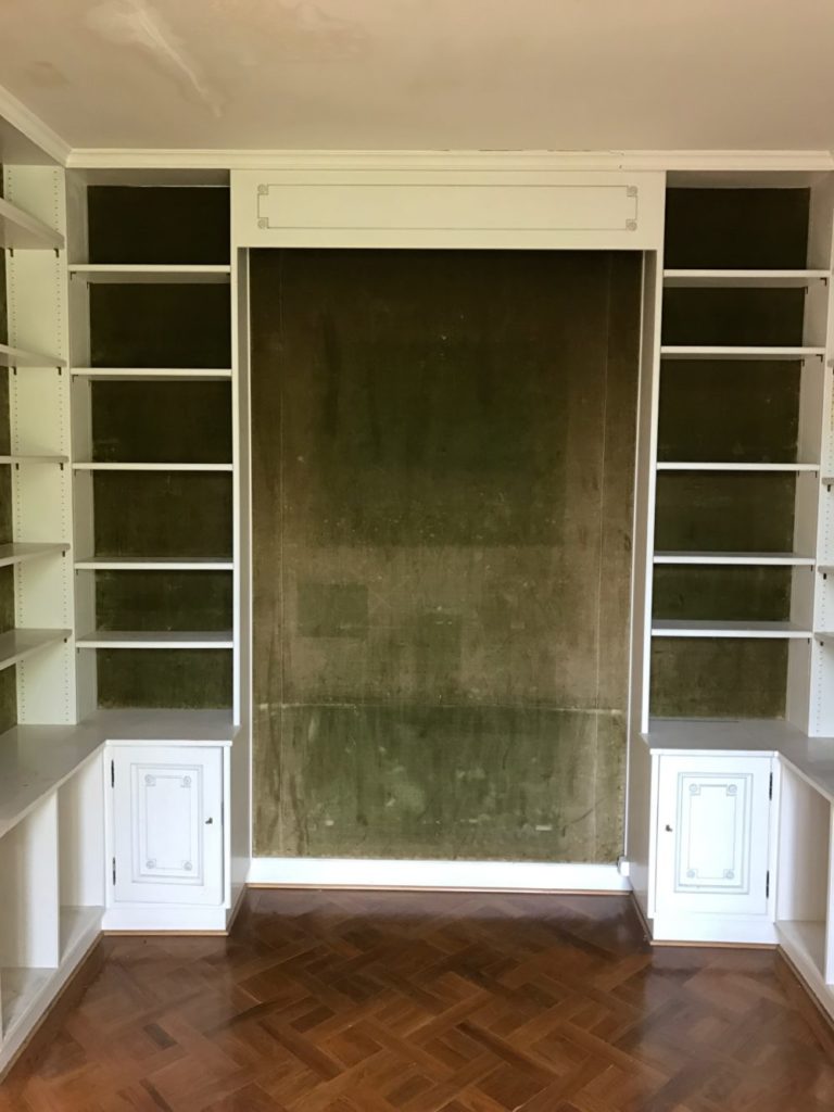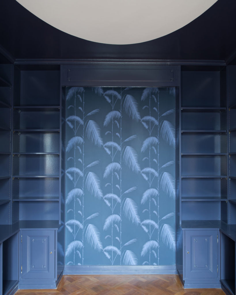 Entièrement repeinte en bleu sombre pour favoriser l’introspection, la pièce bibliothèque conserve son mobilier d’origine animé par un papier peint au motif « fougère ». Un halo ovale blanc illumine le plafond.
