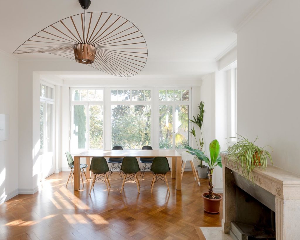 La maison s’est divisée en trois lots distincts: l’appartement des propriétaires (rez et premier étage), un appartement indépendant de 2 pièces (au niveau inférieur) avec accès direct au jardin, et dans les combles, deux chambres de bonne ont été reconfigurées pour obtenir un mini-appartement avec vue sur le lac.