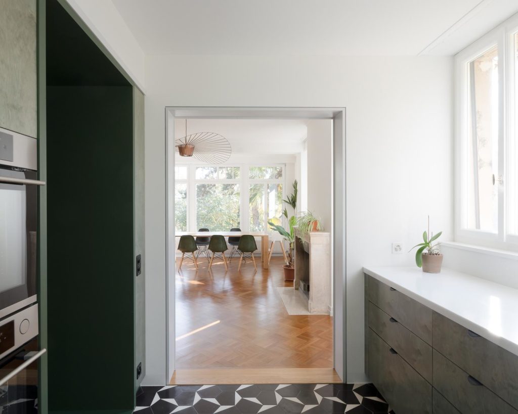 Dans l’appartement des propriétaires, la restauration des éléments d’origine a été privilégiée au maximum. Quelques articulations-clés ont toutefois été revues pour répondre à l’usage des propriétaires. Voici quelques exemples du résultat.
