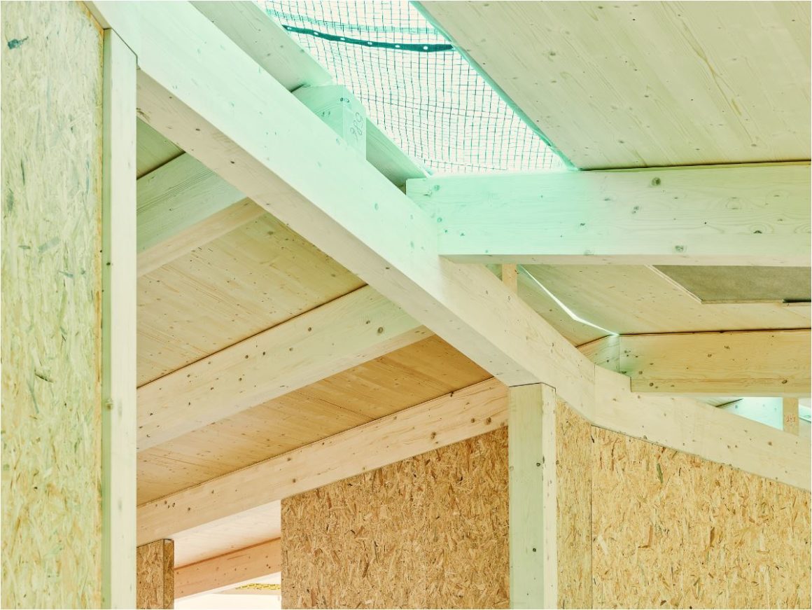 En toiture, le bois a été traité en autoclavage afin de lui conférer une plus grande stabilité dans le temps. Pour le bureau Kunik de Morsier, c’était l’occasion de tester ce type de traitement sur du sapin qui permet de le rendre aussi résistant dans le temps que le mélèze.