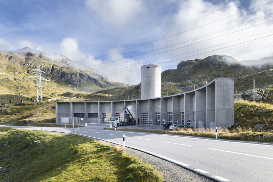 Centre d’entretien du canton chargé du déneigement du col de Bernina construit par Bearth & Deplazes Architekten en 2019. Le climat extrême, la fonction de l’ouvrage et le souhait d’obtenir une structure porteuse aussi économe en matériaux et en argent que possible ont motivé le choix logique du béton apparent La traduction des exigences fonctionnelles en formes géométriques élémentaires ancre le bâtiment dans son environnement: il fait corps avec le paysage, tout en étant d’une expressivité emblématique. A noter qu’une fonction supplémentaire a été ajoutée à ce bâtiment essentiellement utilitaire: au somment du silo a été intégré un observatoire du paysage.