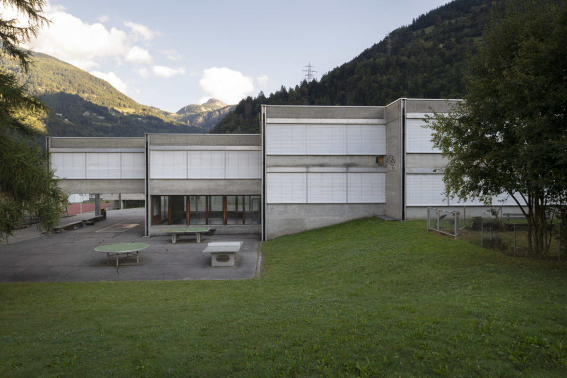 La commune de Poschiavo a réuni ses écoles, jusque-là séparées tant sur le plan confessionnel que géographique, en un seul centre scolaire. Conçu en 1969 à la suite d’un concours, le projet a été réalisé par l’architecte Andry Flurin. Par son expression architecturale brutaliste, qui contraste fortement avec l’église baroque voisine, cet ensemble traduit l’apaisement du climat social.