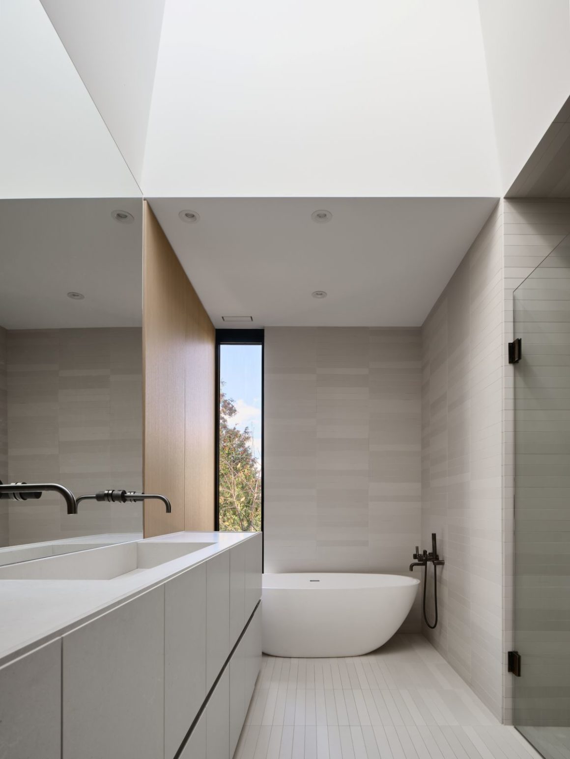 Exemple de carrelage au format « baguette » tout en longueur (7,5 x 40 cm) posé du sol jusqu’au plafond. Salle de bain conçue par le StudioAC dans le projet Noel Residence.