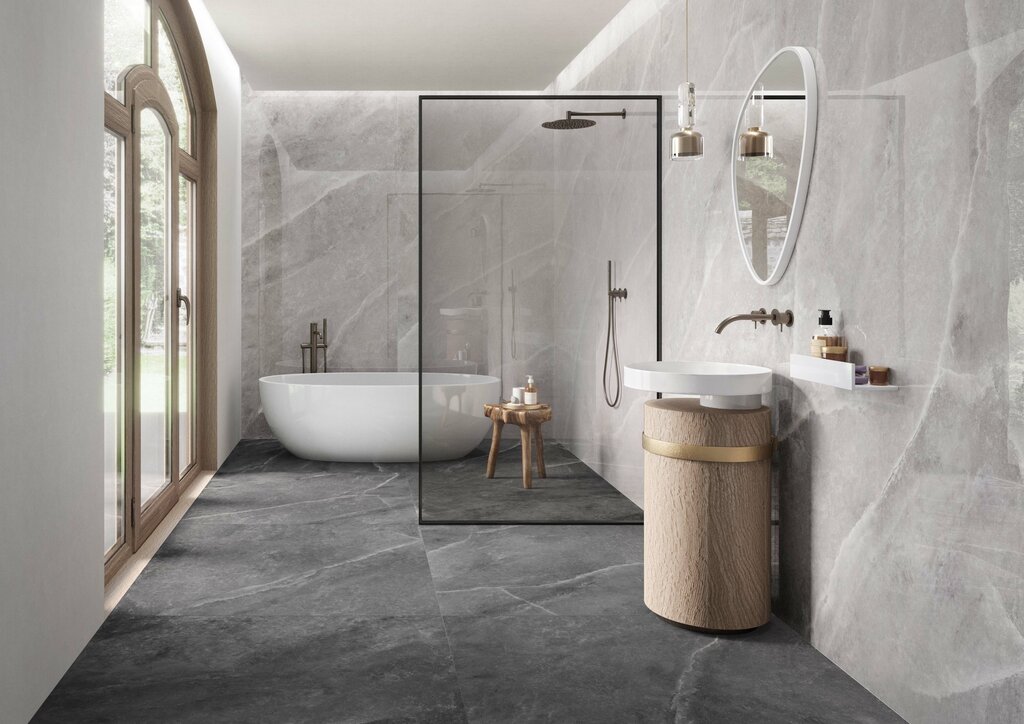Salle de bain avec au sol, un carrelage foncé; aux murs, un carrelage clair posé jusqu’au plafond. Carrelage Supreme, Casalgrande Padana.