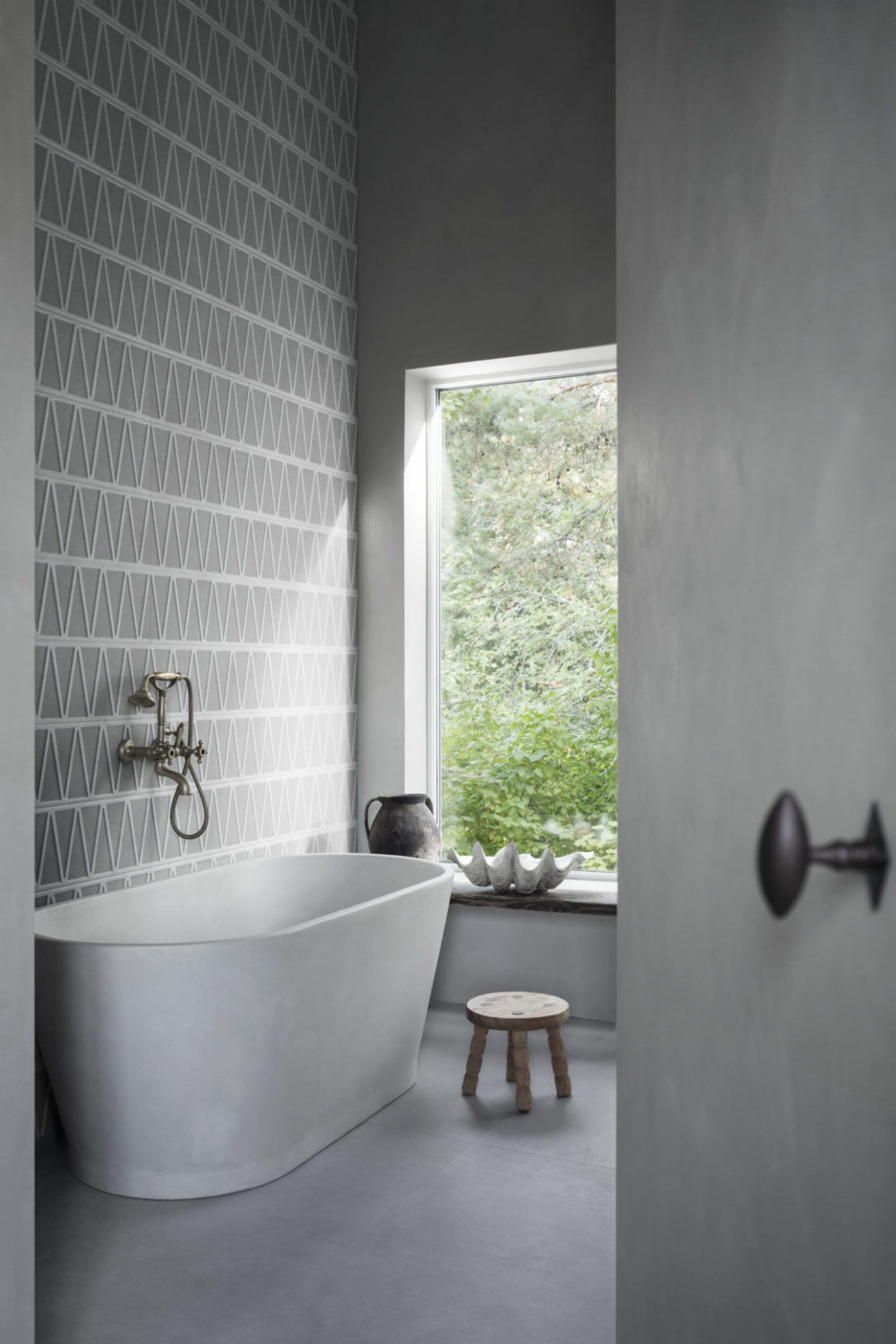 Le « color drenching »- l’utilisation d’une seule couleur, ou d’une teinte similaire, sur toutes les surfaces- se fait de plus en plus. Alors pour animer une surface murale tout en restant dans le monochrome, on opte pour le « pattern blocking ». Le principe est un peu le même que le « color blocking » présenté ci-dessus car, en fonction des zones d’utilisation, on crée des blocs de carrelage entre lesquels le contraste visuel sera fort. Néanmoins, cette différence visuelle résulte moins de la couleur que du format, du relief ou des motifs des carreaux.