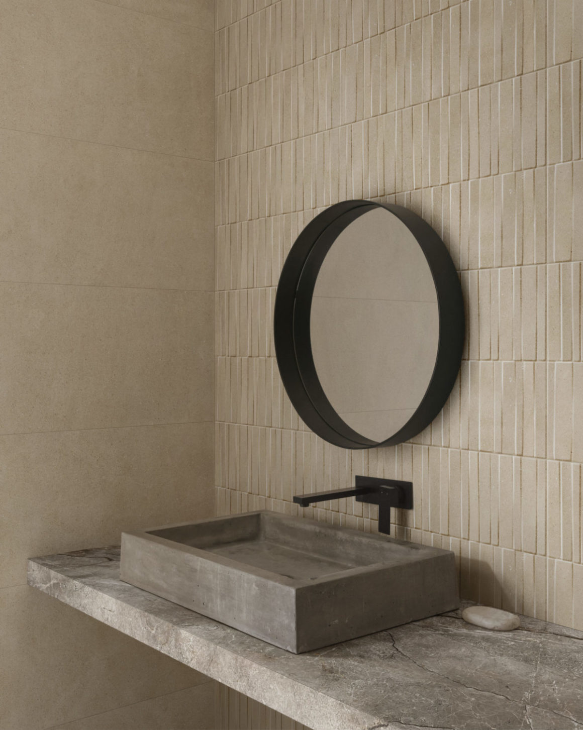 Sur la zone lavabo, un carrelage en relief posé sur toute la hauteur du mur délimite l’espace.