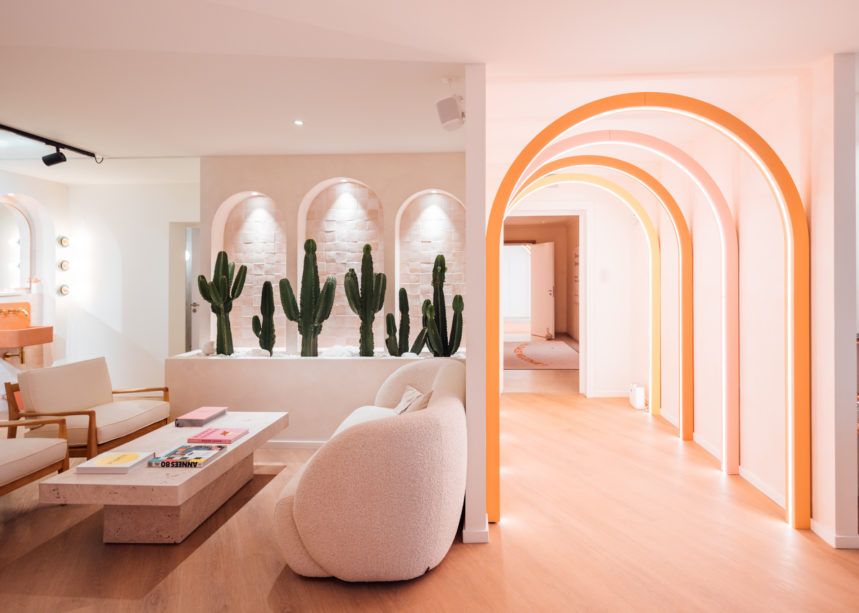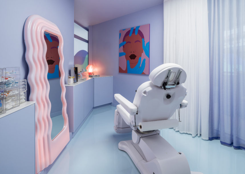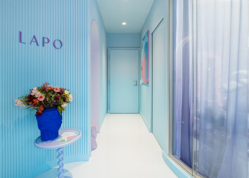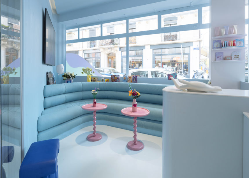 Tenue par trois médecins, LAPO the skin club est une clinique accès sur le bien-être de la peau et la chirurgie esthétique qui casse les codes pour se rapprocher de l’univers des enseignes de beauté. L’aménagement se veut ainsi particulièrement photogénique, à la manière des images postées par les influencers sur les réseaux sociaux. Sur fond de murs bleus, des miroirs, des guéridons, des tabourets et des tableaux vêtus de rose attirent inévitablement l’œil. La grande difficulté pour l’équipe de Coral Studio a été de créer un espace fonctionnel dans un tout petit volume avec une majorité de façades vitrées. L’équipe a su jouer avec ces contraintes et réaliser un aménagement irisé qui attire la curiosité des passants dans un quartier animé par les bars et les restaurants. Leur équipe de suivi des travaux – Urbica- s’est chargée de concrétiser le projet et de gérer le chantier.