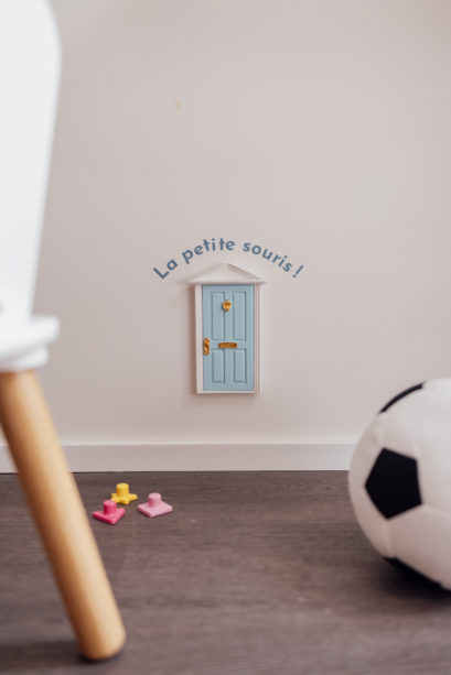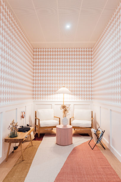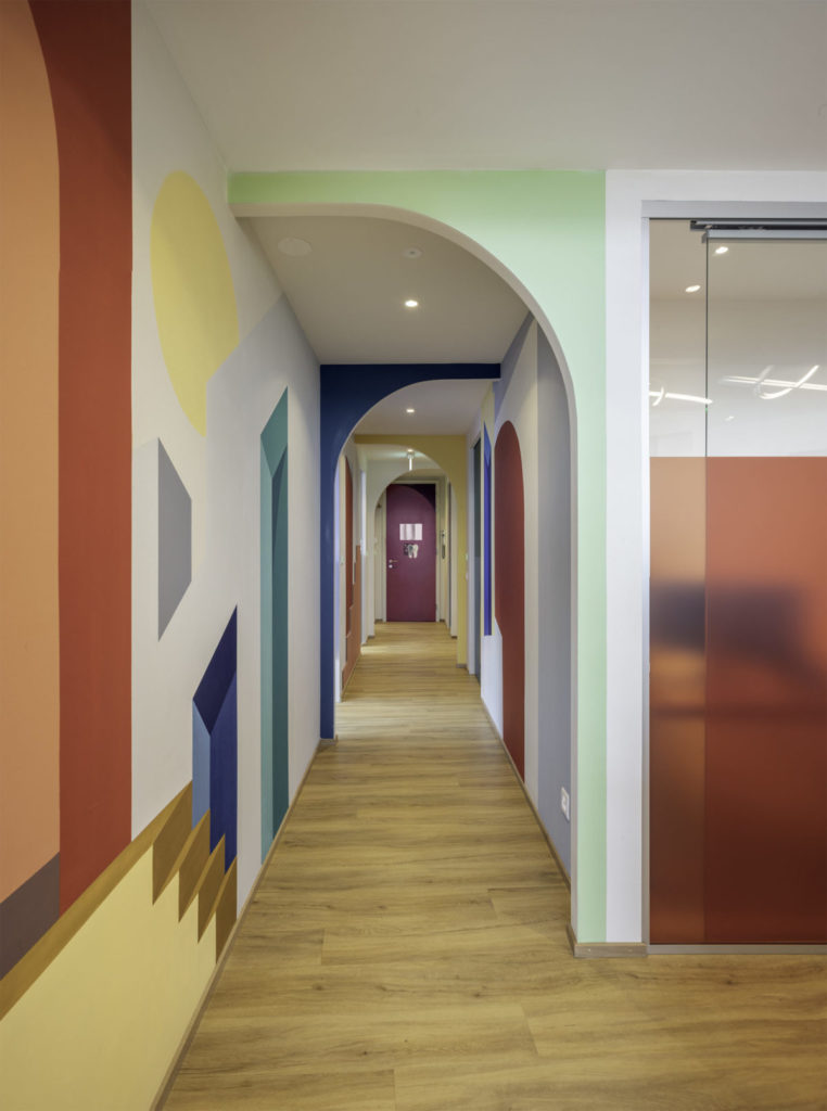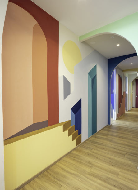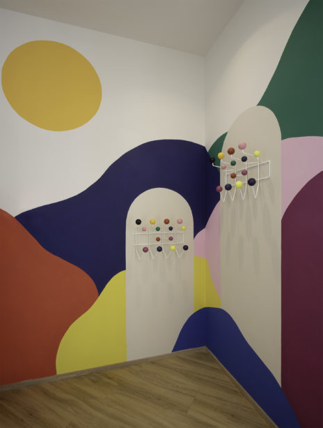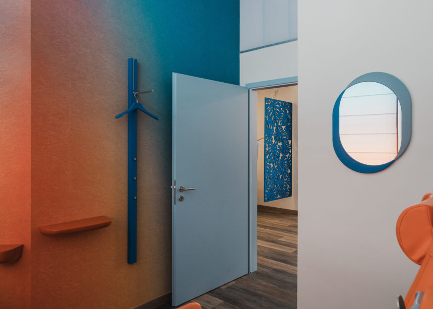 Ici la palette de couleurs vives dominent. Dans les couloirs du cabinet, une grande fresque murale – trompe-l’oeil graphique inspiré du maître du genre Escher – donne une perspective architecturale à l’espace, tandis qu’un paysage aux formes organiques réalisé en collaboration avec l’illustratrice invitée Anaïs Coulon pose le décor de la garde-robe, ornée de patères assorties.