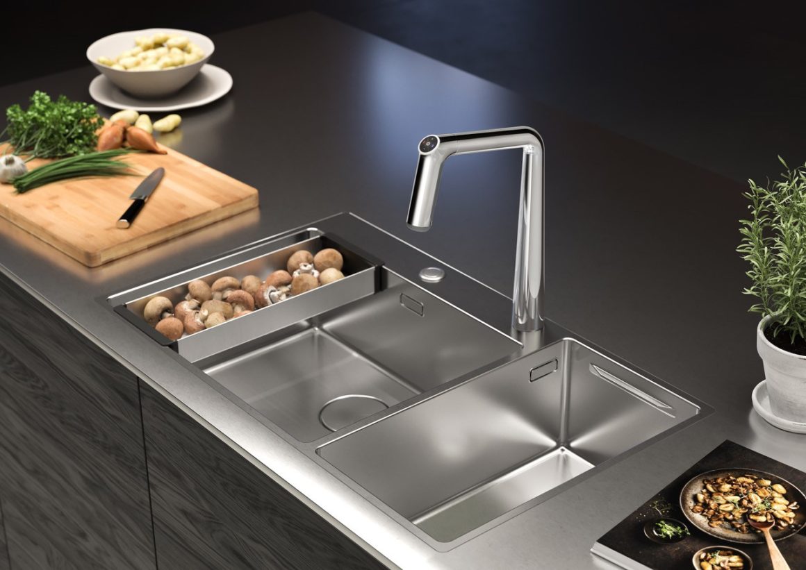Dans le robinet Kio de KWC, un clavier de contrôle de l’eau a été intégré au sommet du bec du robinet. Il permet de régler la température, le volume et le type du jet d’eau d’une seule main. L’anneau lumineux donne des indications de température. Ce modèle existe avec ou sans douchette extractible.