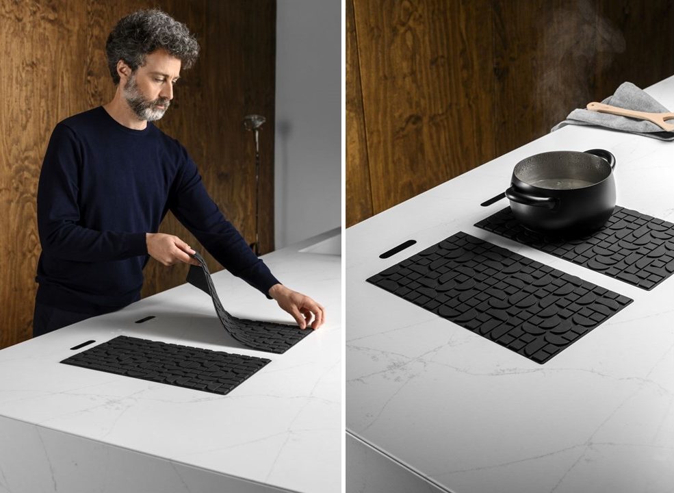 Le fonctionnement du tapis de cuisson Cooking Mat de Lapitec est simple. En déroulant le tapis en silicone sur le plan de travail, des commandes tactiles s’activent et permettent d’allumer un système de cuisson à deux ou quatre brûleurs. En l’absence du tapis, aucun feu ne peut être allumé. Le plan de travail semble dépourvu d’éléments de cuisson et laisse voir la beauté de la matière qui le compose. En dehors de quelques incisions, le plan est totalement libre.