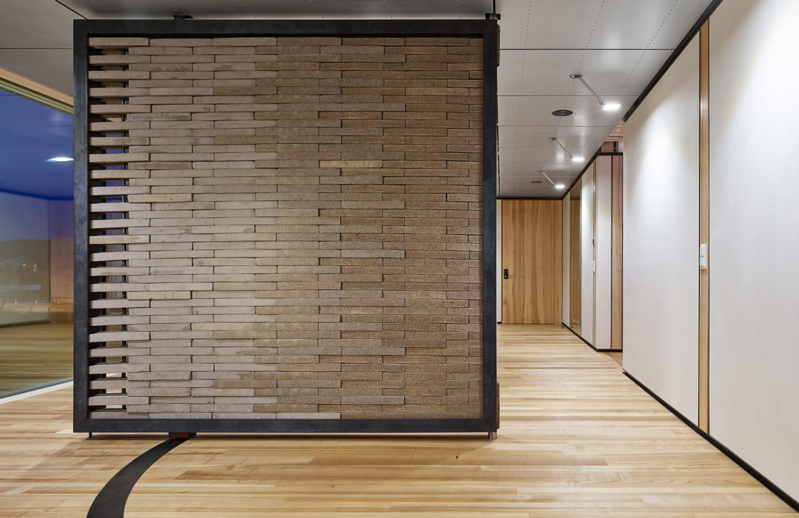 Espace résidentiel UMAR, dans le bâtiment Nest de l’EMPA à Dübendorf (Suisse). Les briques StoneCycling ont été utilisées pour construire un mur tournant sans mortier. Architecte: Werner Sobek Group.