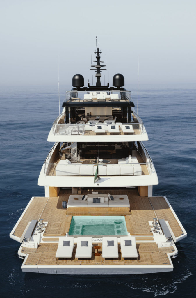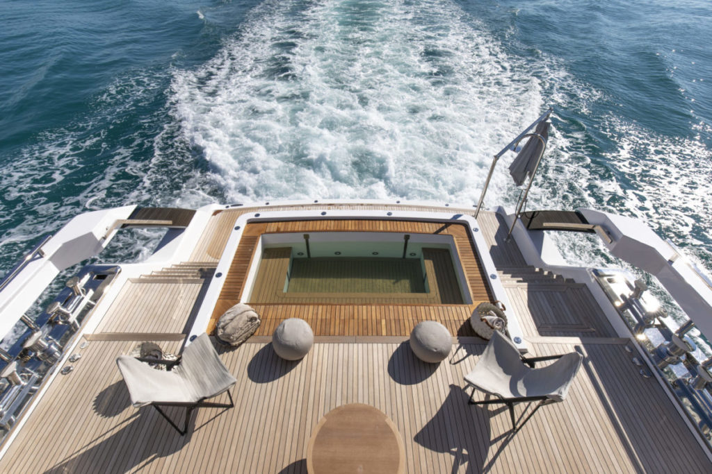 L’élément clé du design de ce bateau est le beach club (dite aussi plage ou zone d’accès la plus directe à la mer ). Il est conçu sur deux niveaux avec une piscine à débordement et un fond relevable. Autre espace idéal pour profiter de la mer, le cockpit arrière qui se présente également comme une agréable zone de vie.