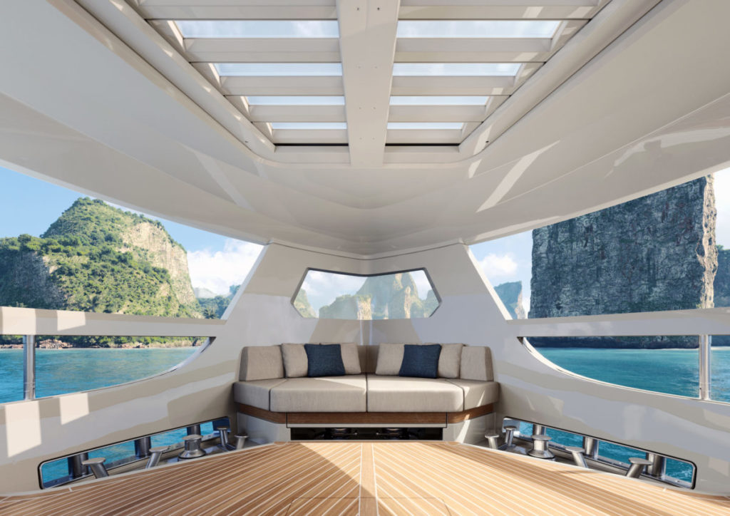 Pour profiter de l’espace extérieur du bateau toute l’année, Ferretti a conçu une « All Season Terrace » située à l’avant du bateau. Le toit est disponible en version fermée ou ouvrante grâce à des lamelles en verre orientables. Ici, un espace privé et confortable est créé, incluant dans la version standard une zone repas avec table et, en option, un bar à cocktails.