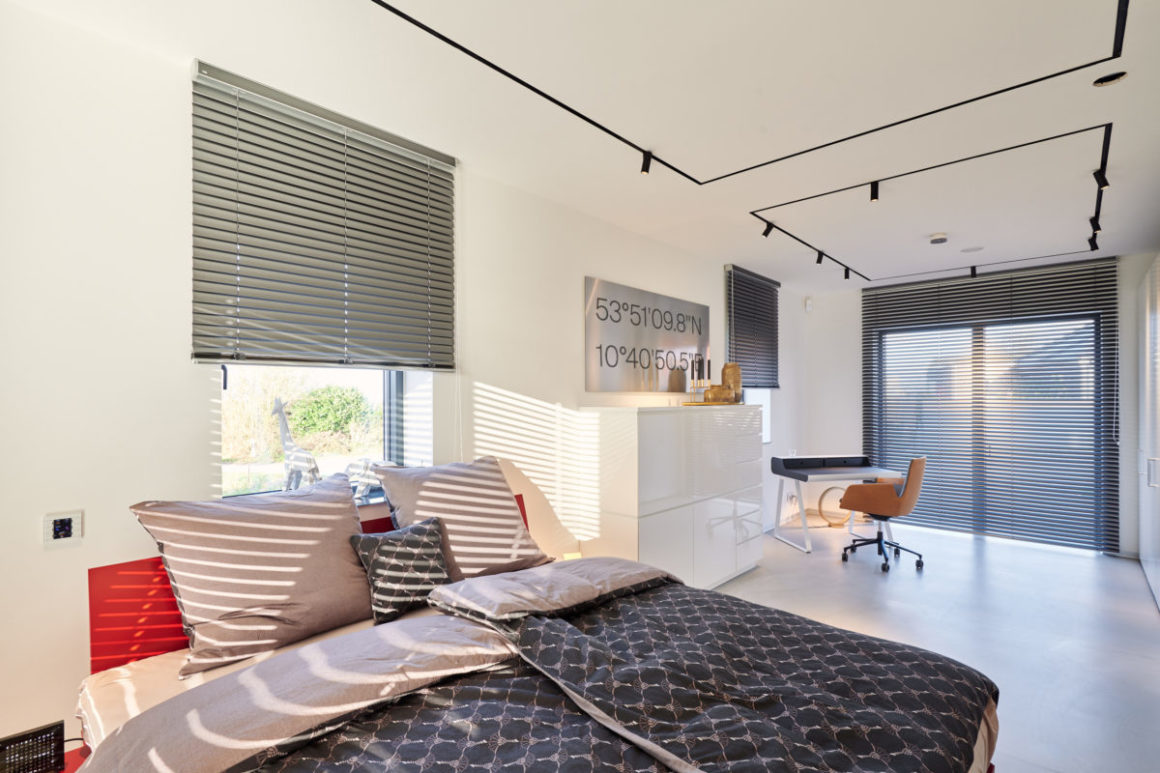 Afin d’obtenir un bon éclairage général, multiplier les sources de lumière périphériques au plafond peut également s’avérer judicieux. On peut ainsi opter pour des spots, qui seront plus judicieusement placés en direction d’une zone d’usage (placard, espace de circulation, bureau…) plutôt qu’au centre de la pièce. En effet, dans une chambre, la lumière doit être suffisamment douce près du lit pour pouvoir créer un havre de paix et une atmosphère paisible et feutrée.