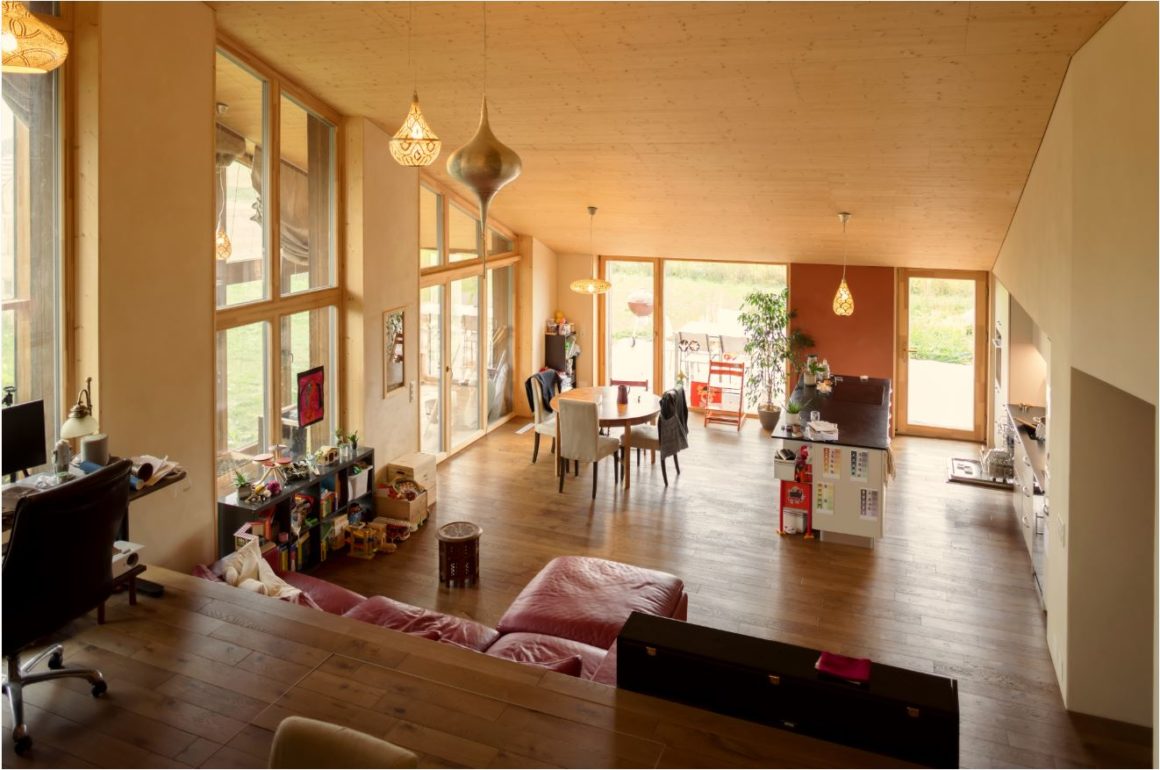 La structure en bois massif de la région d’Appenzell est assemblée sans colle, à l’aide de chevilles. La laine de chanvre, les panneaux de fibres de bois et le liège sont les isolants biosourcés utilisés. Les murs intérieurs et les plafonds sont partiellement recouverts de panneaux d’argile qui régulent l’humidité et absorbent les odeurs.