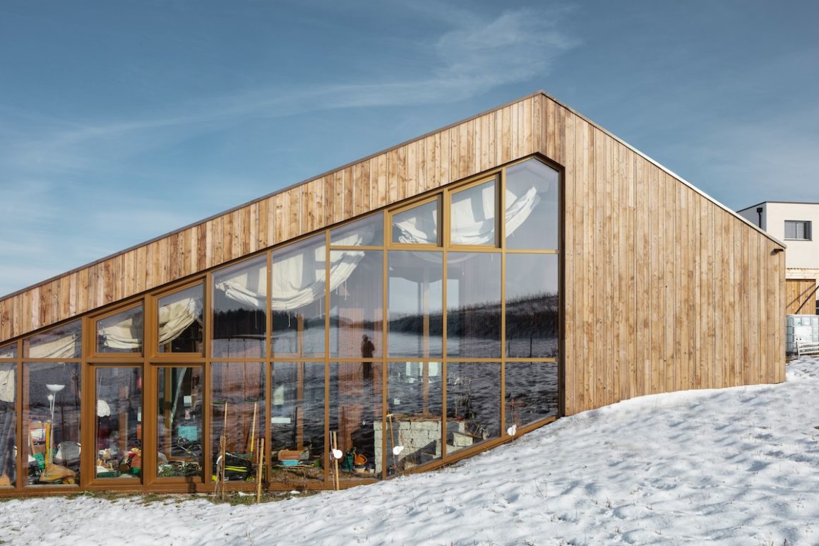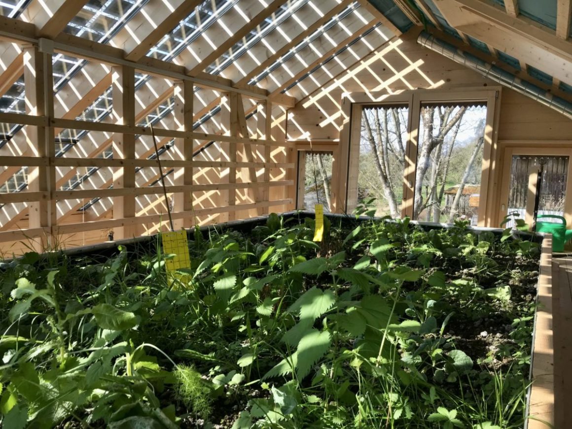 Ce pavillon est un démonstrateur du concept d’économie circulaire dans son approche globale. Le pavillon de 40 m2 peut accueillir deux personnes dans une unité d’habitation isolée, chauffée et réduite au minimum. L’espace de vie s’agrandit de plus de la moitié de la surface lorsque le soleil réchauffe le jardin d’hiver. Celui-ci vient englober la partie contrôlée thermiquement au sud et en toiture, comme une seconde peau. Cette organisation spatiale changeante au rythme des saisons est pertinente vu l’augmentation croissante de la surface habitable par personne et le niveau d’incertitude en matière d’énergie en Suisse.