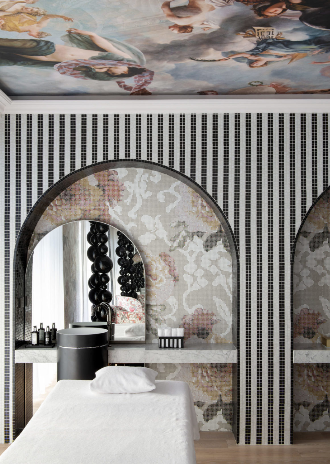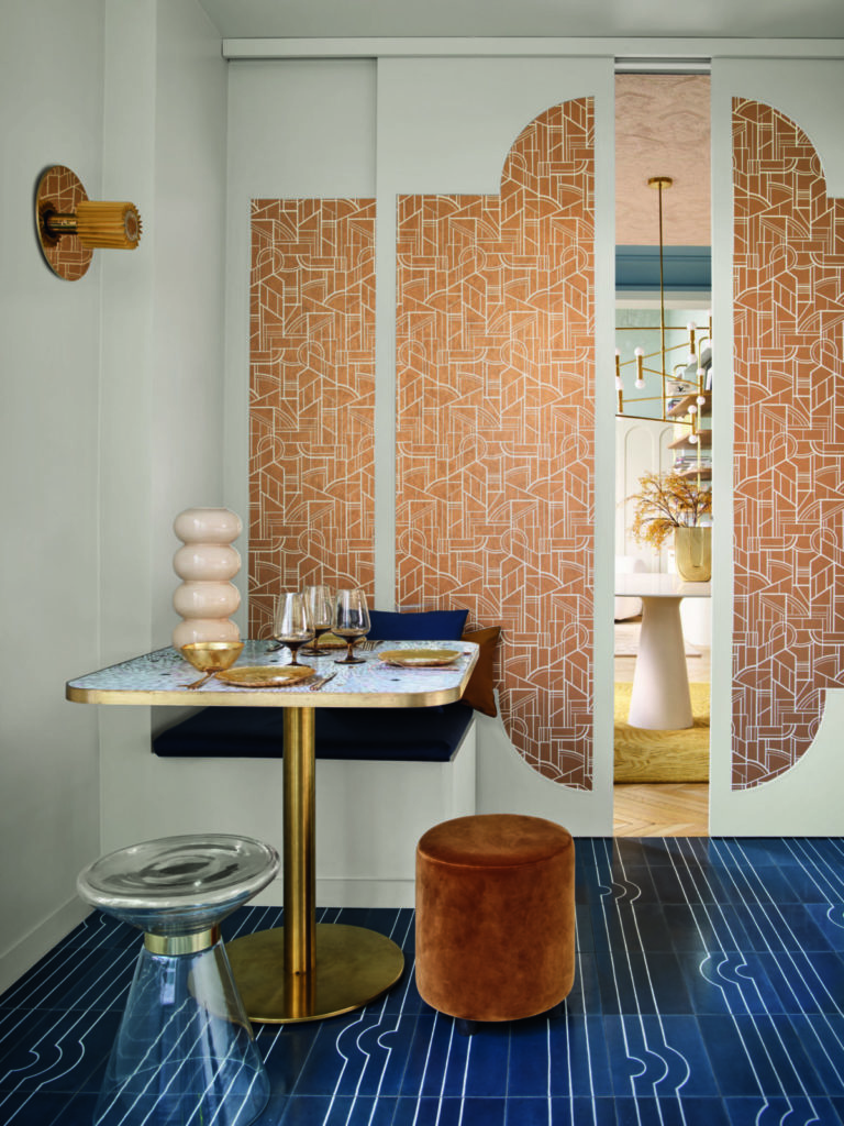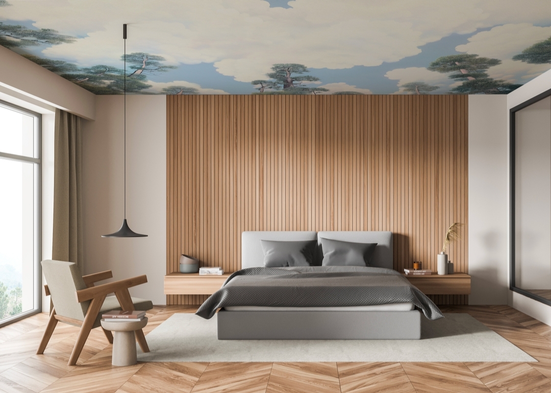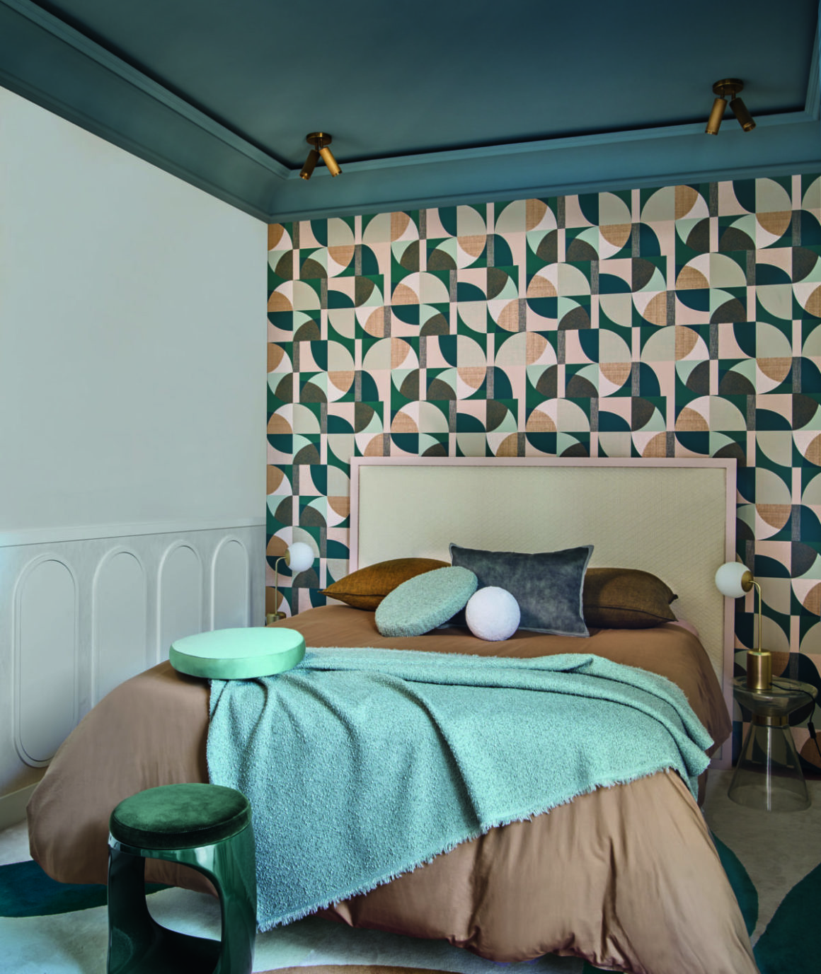 Dans le même esprit, on peut penser à recouvrir la partie supérieure d’un soubassement avec un revêtement à motif. Le plafond aussi peut-être choisi, dans une petite pièce dans laquelle on reste peu comme le dressing ou l’entrée, ou alors dans la chambre pour une invitation à la rêverie depuis le lit.