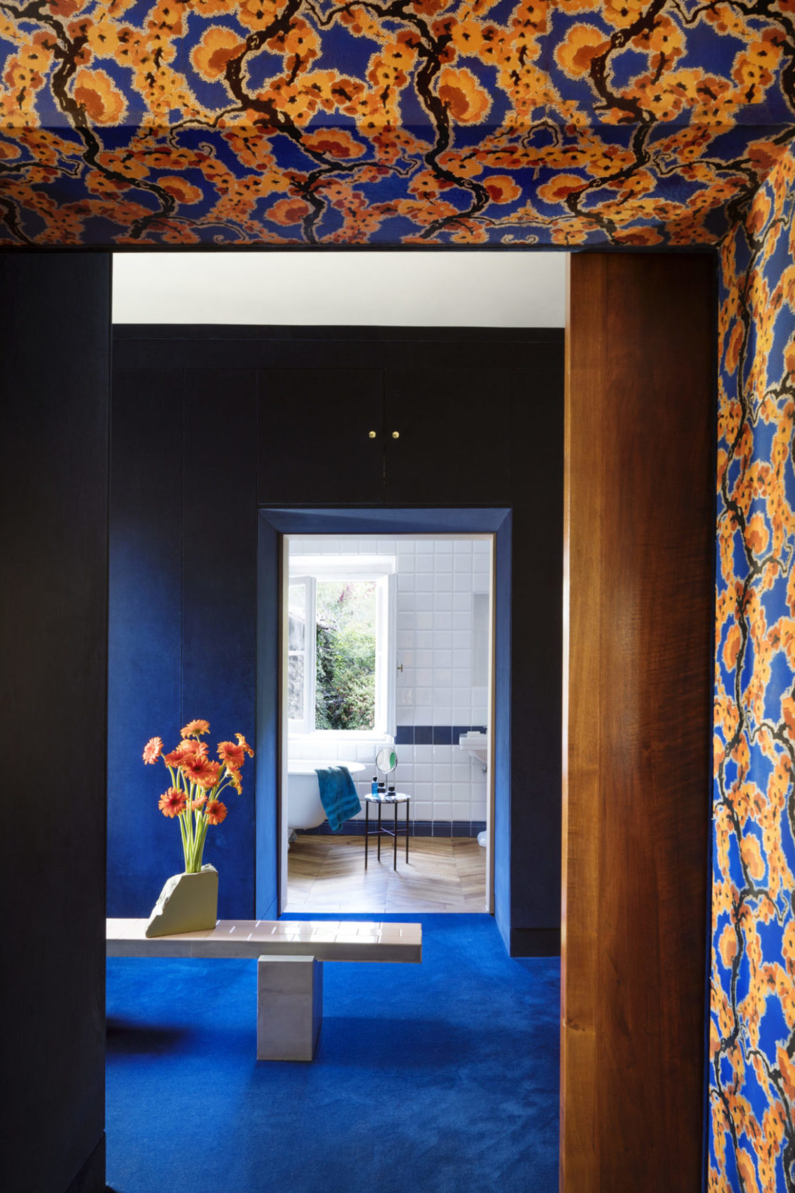 Dans le même esprit, on peut penser à recouvrir la partie supérieure d’un soubassement avec un revêtement à motif. Le plafond aussi peut-être choisi, dans une petite pièce dans laquelle on reste peu comme le dressing ou l’entrée, ou alors dans la chambre pour une invitation à la rêverie depuis le lit.