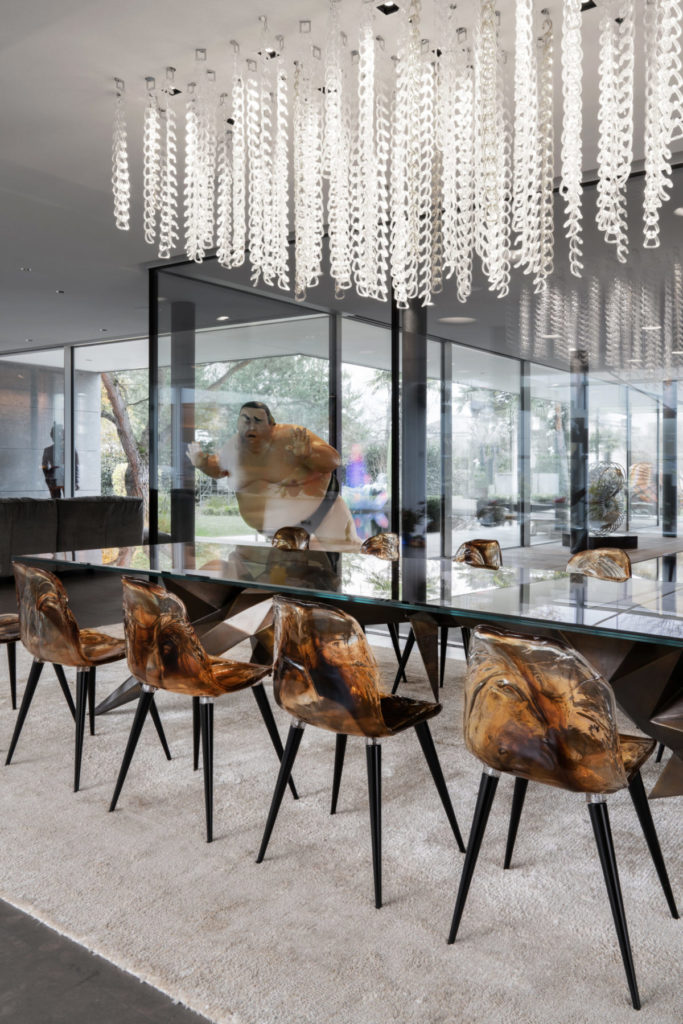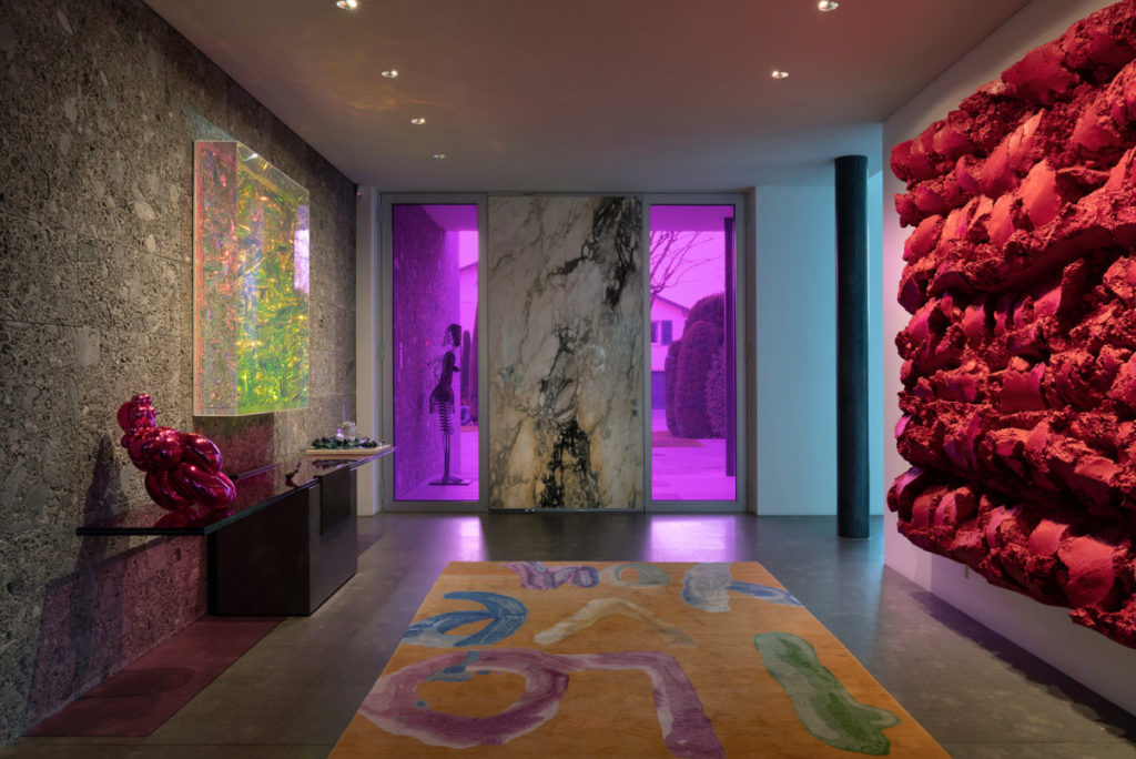 Mandaté pour l’aménagement intérieur de la villa, l’architecte Roberto Falconi a laissé l’austérité au rancart et parié sur la flamboyance afin d’accueillir la succession d’œuvres d’artistes célèbres. «Intégrer la collection dans l’agencement fut un défi passionnant, certaines œuvres ont été des points de repère à partir desquels construire le projet alors que d’autres pièces ont été placées après», explique l’architecte italien, passionné lui aussi d’art contemporain.