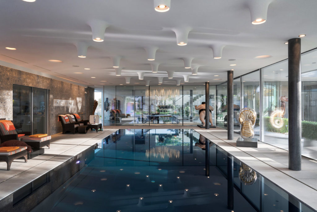 Plantée au sein de la végétation du parc qui l’entoure, l’architecture se partage entre dissimulation et ouverture avec des grandes baies vitrées qui créent des échappées visuelles sur le parc et ses sculptures. Ce niveau de plain-pied accueille le hall, le salon et la salle à manger, le fumoir, la piscine couverte, le spa et la salle de gym.