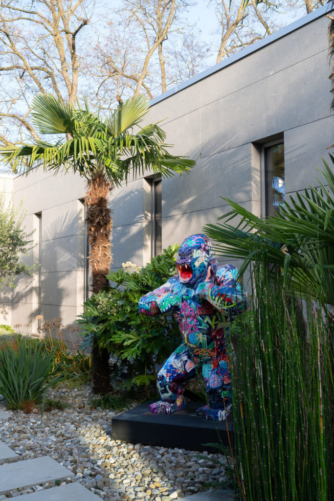 La villa s’étend au cœur d’un jardin arboré peuplé d’importantes sculptures parmi lesquelles émerge du feuillage le Gorille, furibond cerbère pop de Richard Orlinski. Les lignes essentielles de l’architecture s’éclipsent au profit de l’aménagement foisonnant. Le contraste entre l’enveloppe minimaliste et l’opulence du contenu pose la base de ce projet d’une surface totale de 1600 m2 déployée sur deux niveaux.