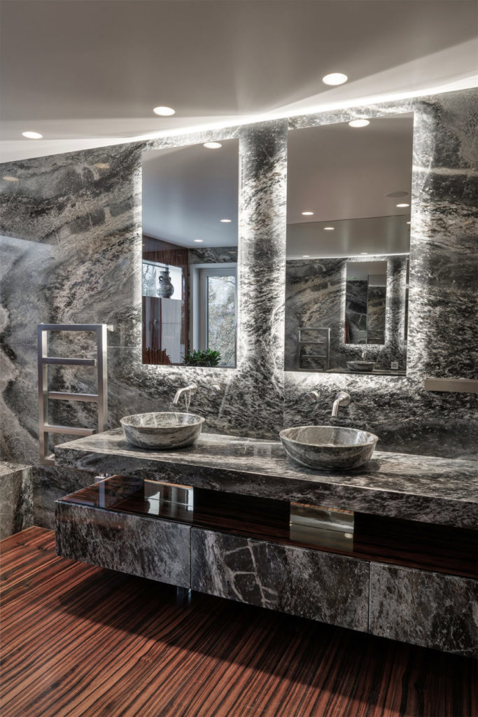 Un autre fil conducteur de l’ensemble du projet est la richesse des matériaux. Dès le début, l’architecte Roberto Falconi a misé sur une pierre qui l’a toujours fasciné, le marbre Ceppo di Gré, un matériau gris et poreux extrait près du lac d’Iseo, au nord de l’Italie non loin de Brescia, ville d’origine de Falconi. Peu utilisée à cause de son apparence très brute, cette pierre tire sa beauté justement de cette irrégularité qui a été ici exploitée au maximum et même encore accentuée pour donner un aspect tridimensionnel. Dans certaines parties, les porosités de la roche marbrée ont été volontairement laissées naturelles pour ajouter un effet de matière, tandis qu’à d’autres endroits la surface a été lissée pour être plus homogène.
