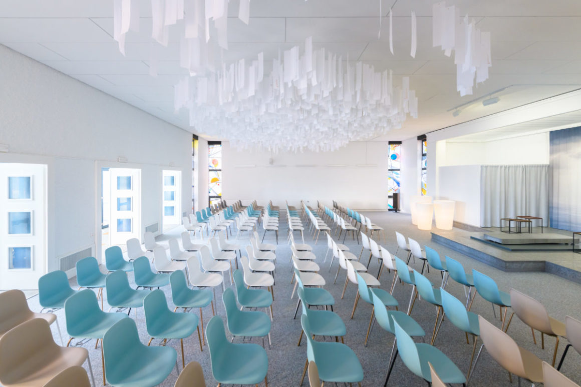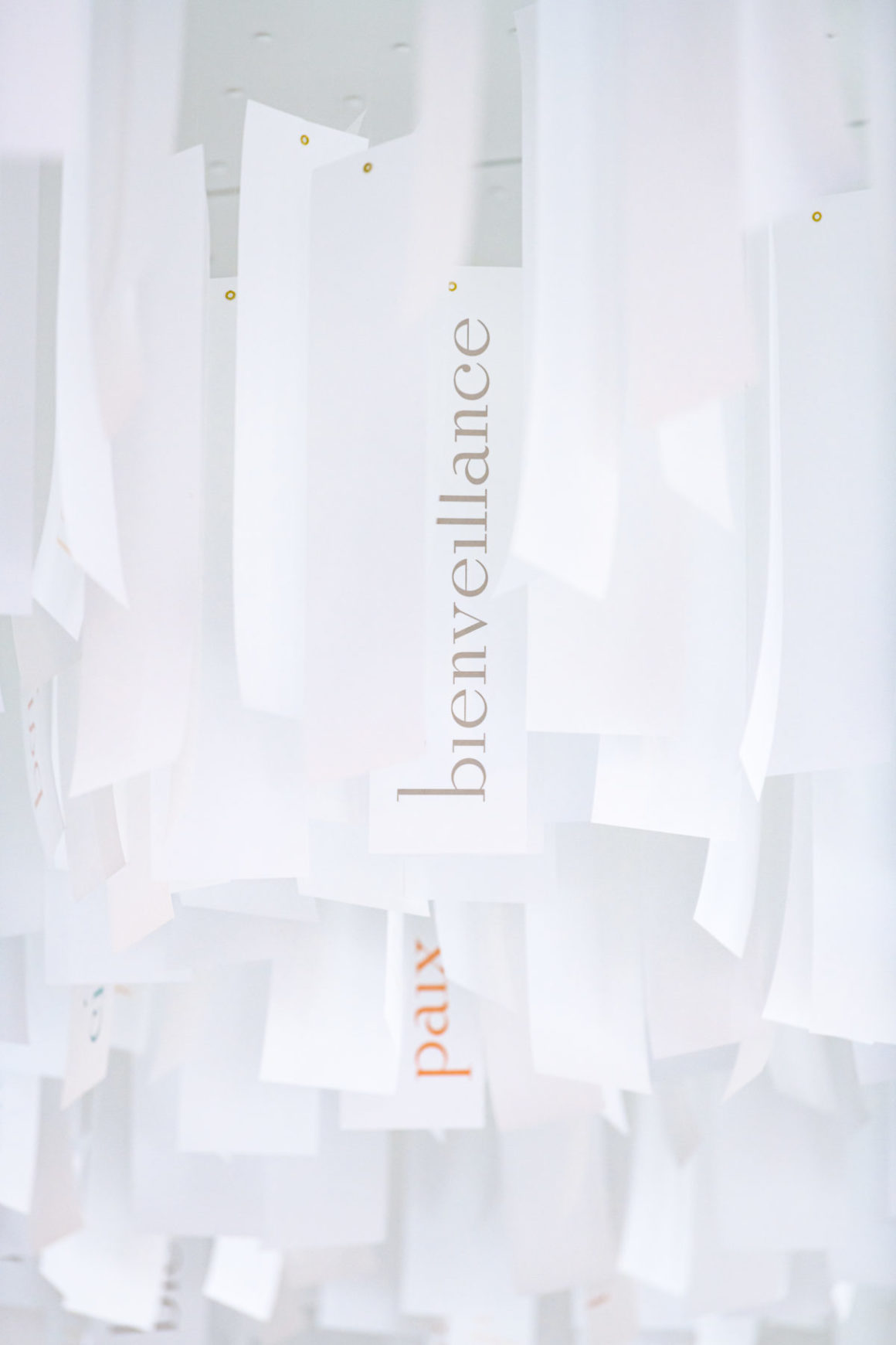 En regardant attentivement l’installation de papier au plafond de la Chapelle, on peut y trouver quatre mots cachés. Quatre mots qui font office de talismans pendant les moments recueillement : paix, ciel, lumière et bienveillance.