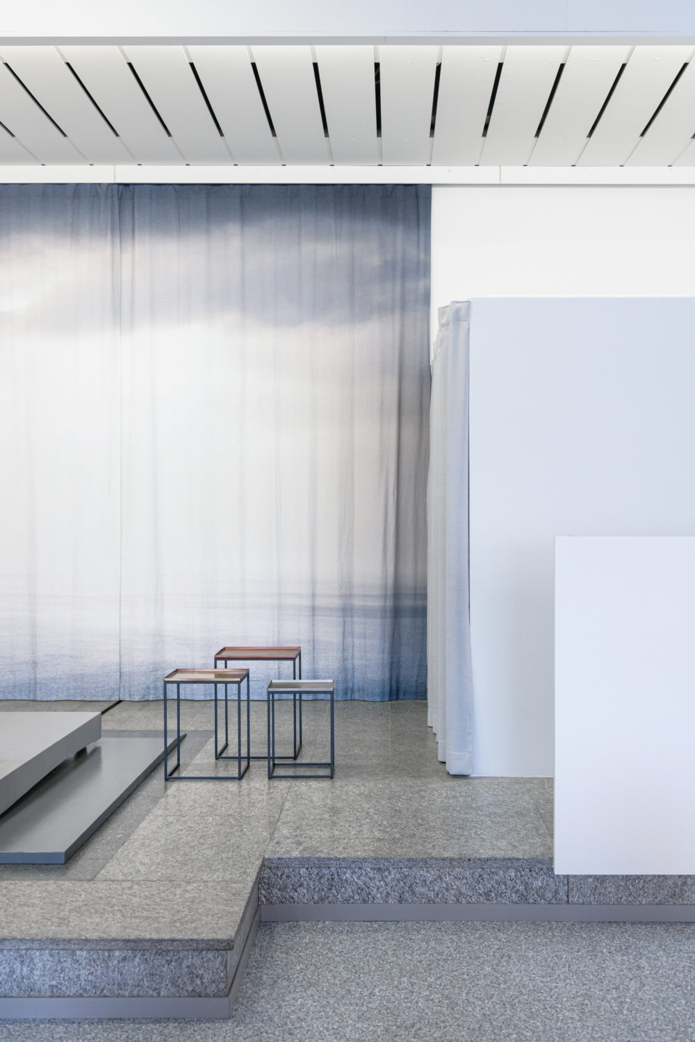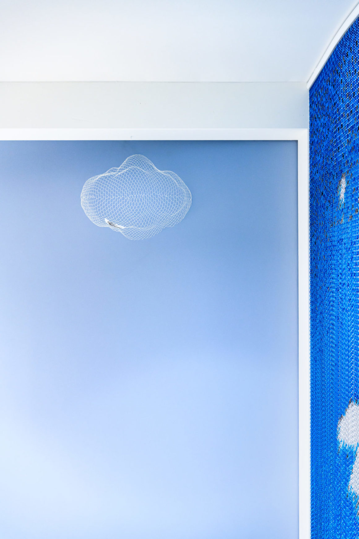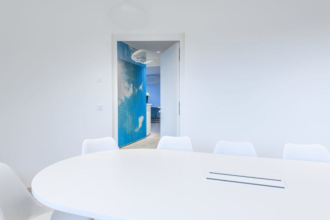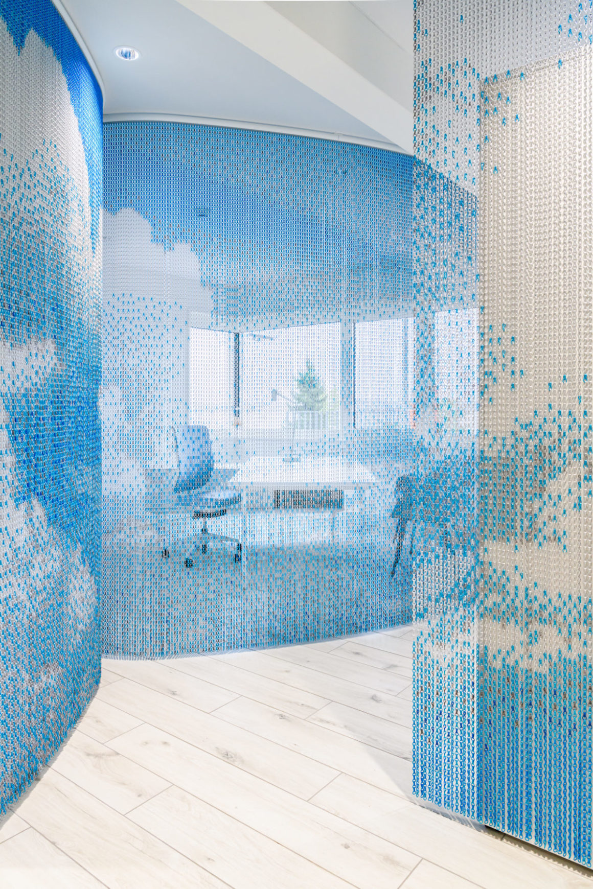 Dans les bureaux, des photographies de nuages ont été imprimées sur les rideaux métalliques qui séparent tout en douceur les différentes zones des bureaux. Ces séparations tout en courbes douces apportent une sérénité et une dimension onirique à l’atmosphère.