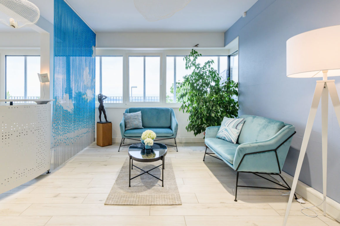 Évocation des reflets de lumière que l’on aperçoit sur le Lac de Neuchâtel en contrebas du cimetière, toute une gamme de bleus a été choisie pour les bureaux. On voyage ainsi du bleu clair poudré sur les murs, aux tons turquoise du mobilier en passant par des notes plus électriques sur les impressions en métal.